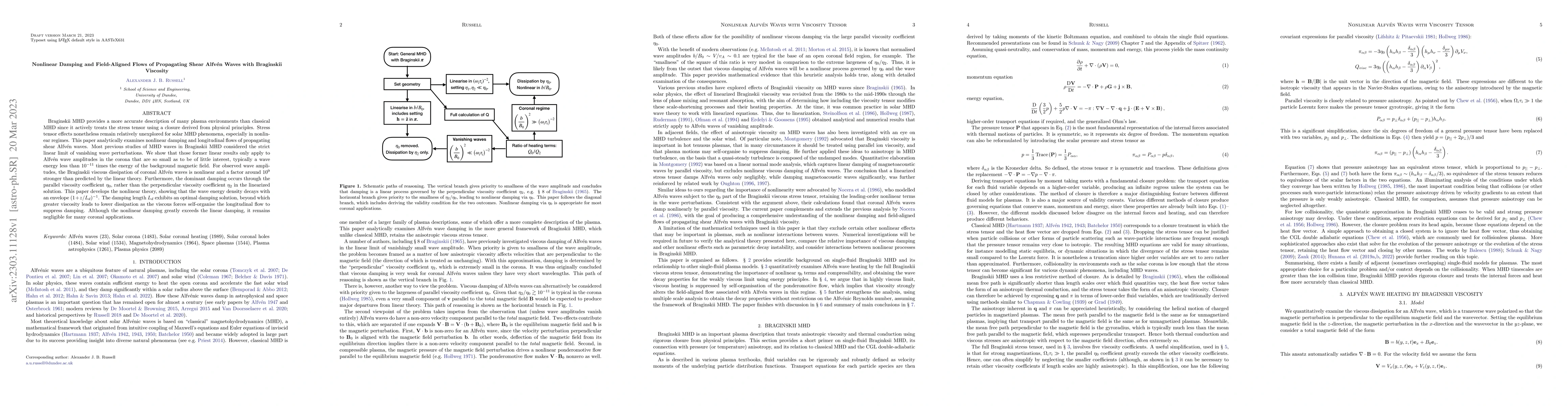This paper analytically explores nonlinear damping and field-aligned flows of propagating shear Alfvén waves in Braginskii MHD, revealing that nonlinear effects are significantly stronger than linear predictions. The study finds that Braginskii viscous dissipation is a factor of $10^9$ greater for observed wave amplitudes, with dominant damping driven by the parallel viscosity coefficient.