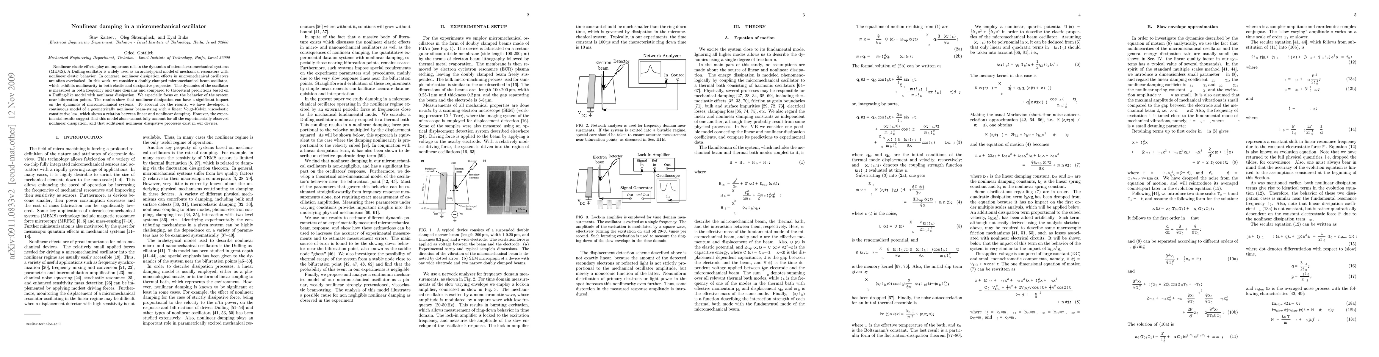 This paper investigates nonlinear damping in a micromechanical oscillator, demonstrating significant impacts of nonlinear dissipation on its dynamics, especially near bifurcation points. The study develops a continuous model incorporating nonlinear viscoelastic behavior and Voigt-Kelvin dissipation, though additional unexplained nonlinear dissipative processes are also identified.