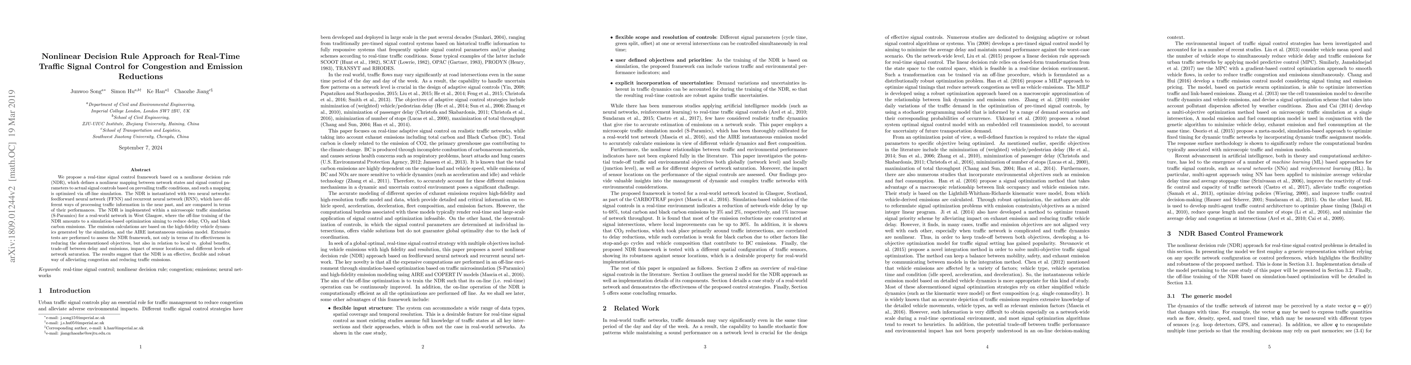 This paper proposes a nonlinear decision rule (NDR) framework for real-time traffic signal control, optimizing signal parameters via off-line simulation to reduce congestion and emissions. The NDR employs neural networks for processing traffic data and is tested in West Glasgow, showing effectiveness in reducing delays and emissions while considering various factors like sensor placement and network saturation.
