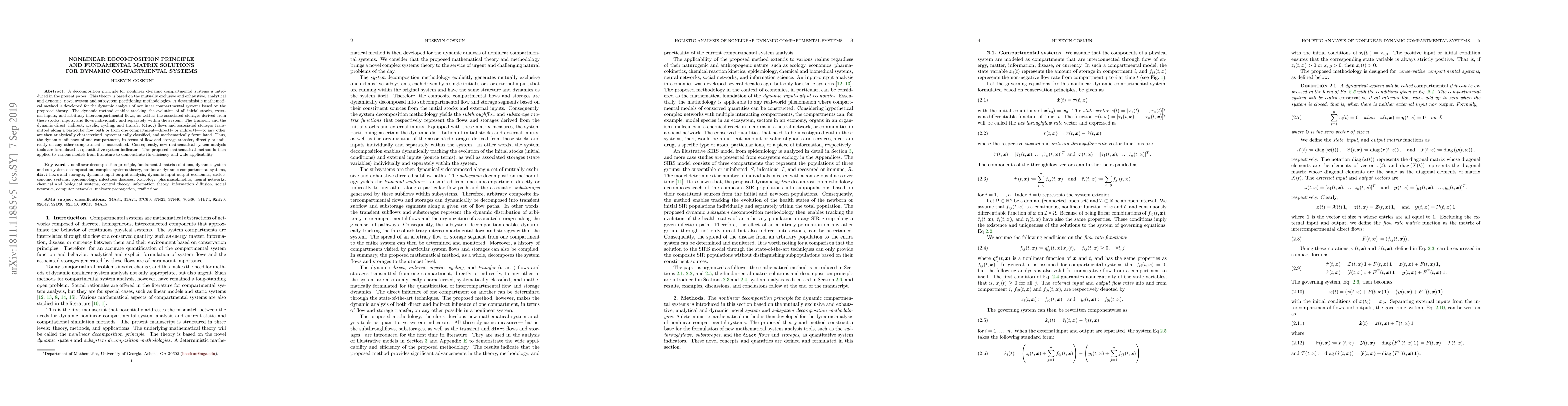 A decomposition principle for nonlinear dynamic compartmental systems is introduced in the present paper. This theory is based on the mutually exclusive and exhaustive, analytical and dynamic, novel system and subsystem partitioning methodologies. A deterministic mathematical method is developed for the dynamic analysis of nonlinear compartmental systems based on the proposed theory. The dynamic method enables tracking the evolution of all initial stocks, external inputs, and arbitrary intercompartmental flows, as well as the associated storages derived from these stocks, inputs, and flows individually and separately within the system. The transient and the dynamic direct, indirect, acyclic, cycling, and transfer (diact) flows and associated storages transmitted along a particular flow path or from one compartment--directly or indirectly--to any other are then analytically characterized, systematically classified, and mathematically formulated. Thus, the dynamic influence of one compartment, in terms of flow and storage transfer, directly or indirectly on any other compartment is ascertained. Consequently, new mathematical system analysis tools are formulated as quantitative system indicators. The proposed mathematical method is then applied to various models from literature to demonstrate its efficiency and wide applicability.