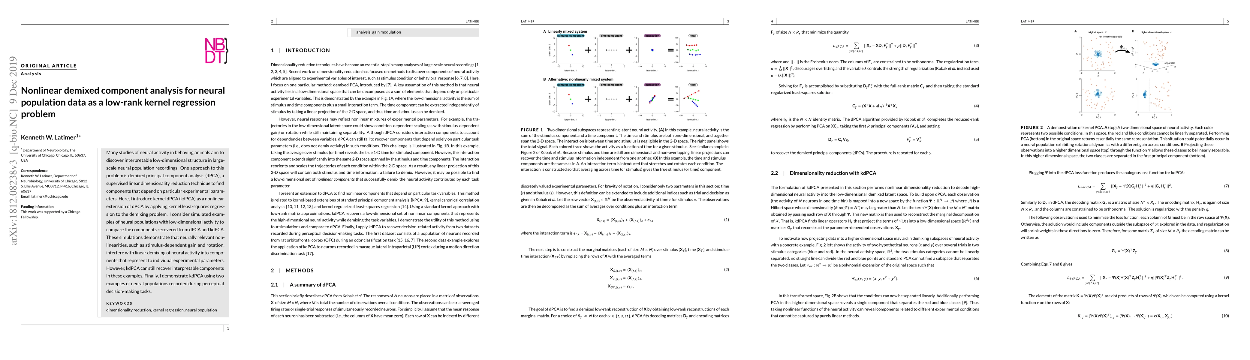 This paper introduces kernel demixed principal component analysis (kdPCA) as a nonlinear extension of dPCA to uncover interpretable low-dimensional structures in neural population data. Simulations show that kdPCA effectively recovers components despite neurally relevant nonlinearities, and it is demonstrated using neural data from perceptual decision-making tasks.