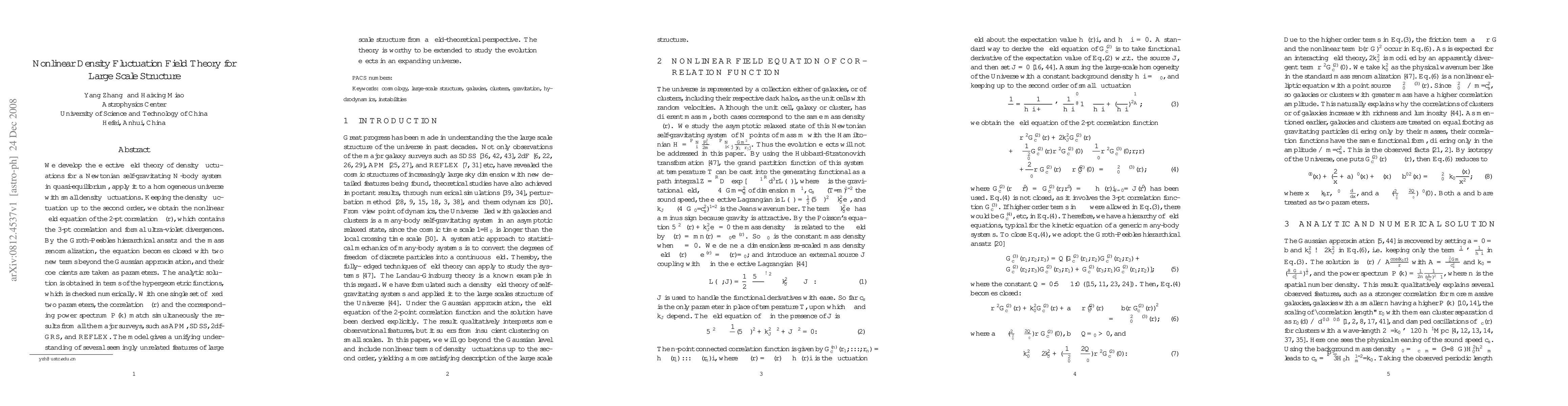 This research introduces a Nonlinear Density Fluctuation Field Theory for large scale structures, deriving a closed-form equation for the 2-point correlation function xi(r) using a homogeneous universe model. With two adjustable parameters, the theory accurately reproduces correlation and power spectrum data from major surveys like APM, SDSS, 2dfGRS, and REFLEX, offering a unified perspective on large scale structure formation in a self-gravitating system.