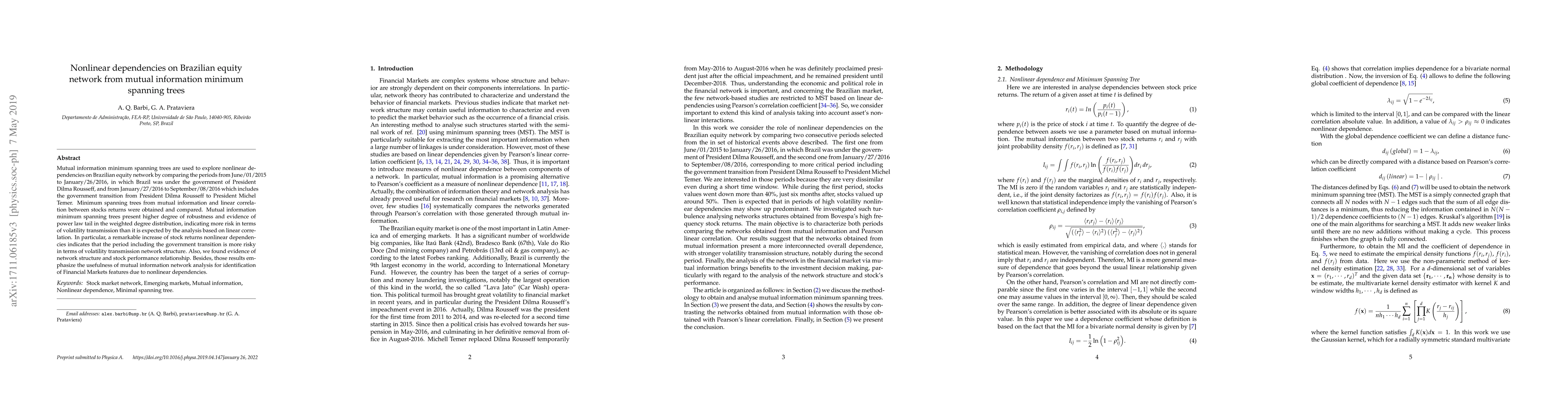This study uses mutual information minimum spanning trees to analyze nonlinear dependencies in the Brazilian equity network during two distinct periods: the Dilma Rousseff government and the transition to Michel Temer's government. The analysis reveals that mutual information networks show higher volatility transmission risk compared to linear correlation, especially during the government transition period.