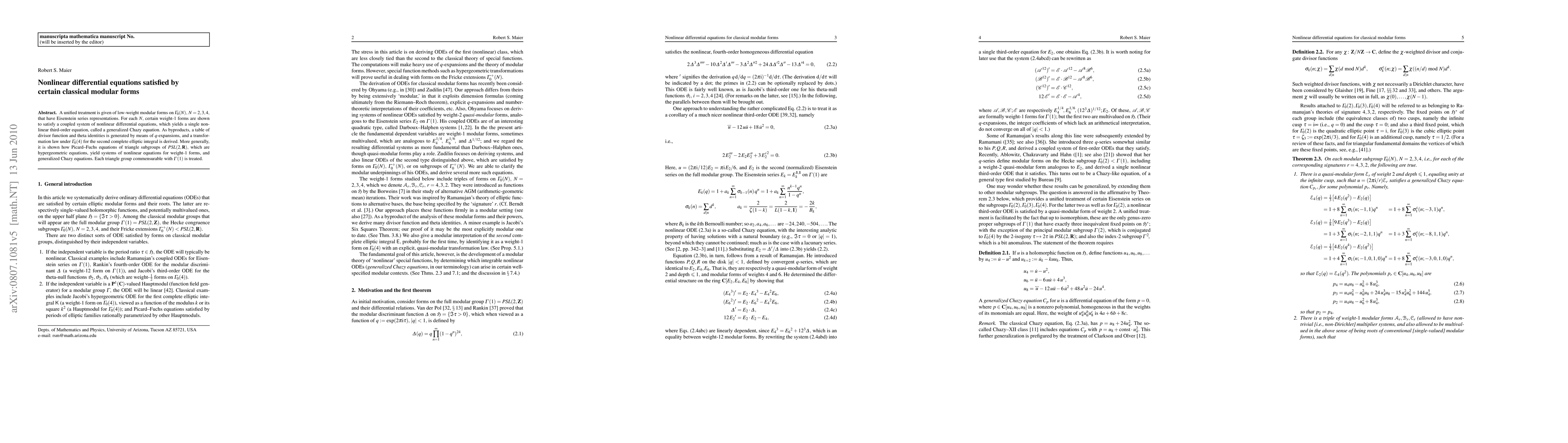 This paper explores low-weight modular forms on specific groups, demonstrating that certain weight-1 forms satisfy a coupled system of nonlinear differential equations, culminating in a generalized Chazy equation. It also derives transformation laws and generates identities via q-expansions.