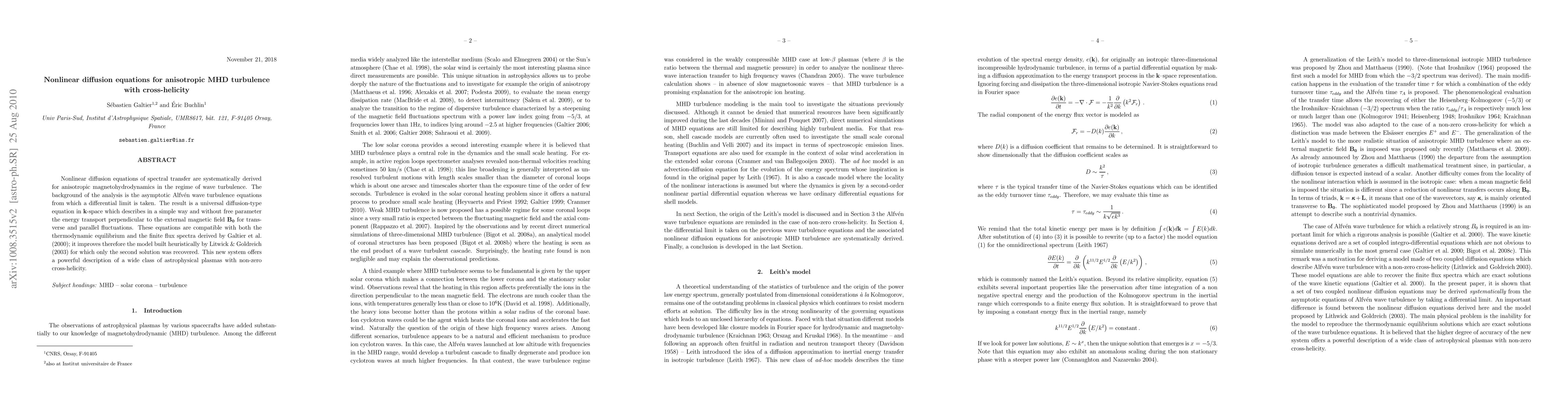 This paper derives nonlinear diffusion equations for anisotropic magnetohydrodynamics (MHD) turbulence, focusing on energy transport perpendicular to an external magnetic field. The results provide a universal diffusion-type equation in k-space that accurately describes transverse and parallel fluctuations without free parameters, enhancing models for astrophysical plasmas with non-zero cross-helicity.