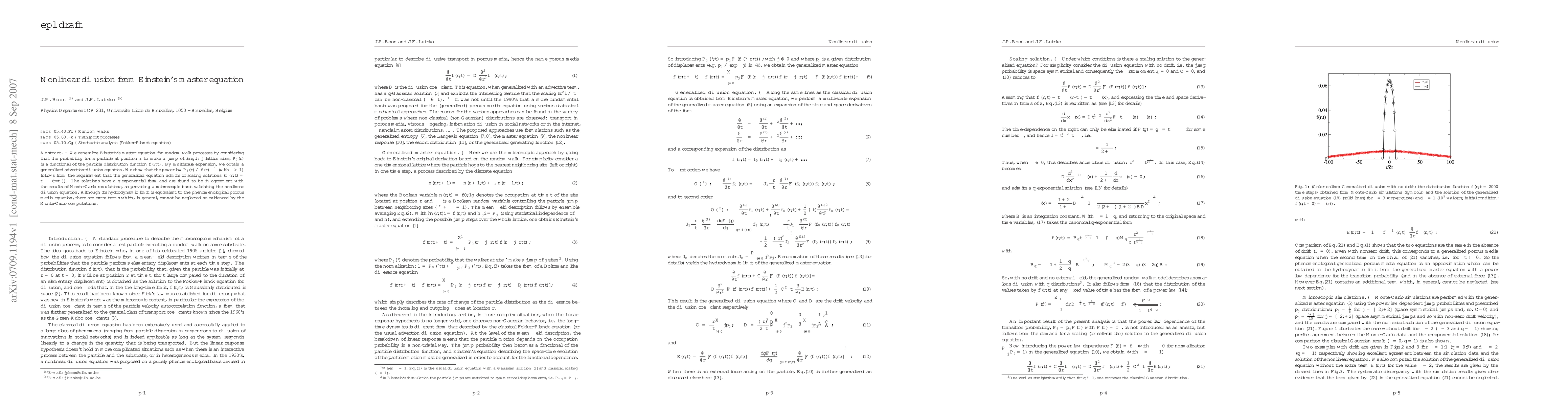 This paper generalizes Einstein's master equation for random walk processes, deriving a nonlinear diffusion equation that incorporates a power law dependence on the particle distribution function. The study validates the equation's solutions through Monte-Carlo simulations and highlights the importance of additional terms beyond the porous media equation.