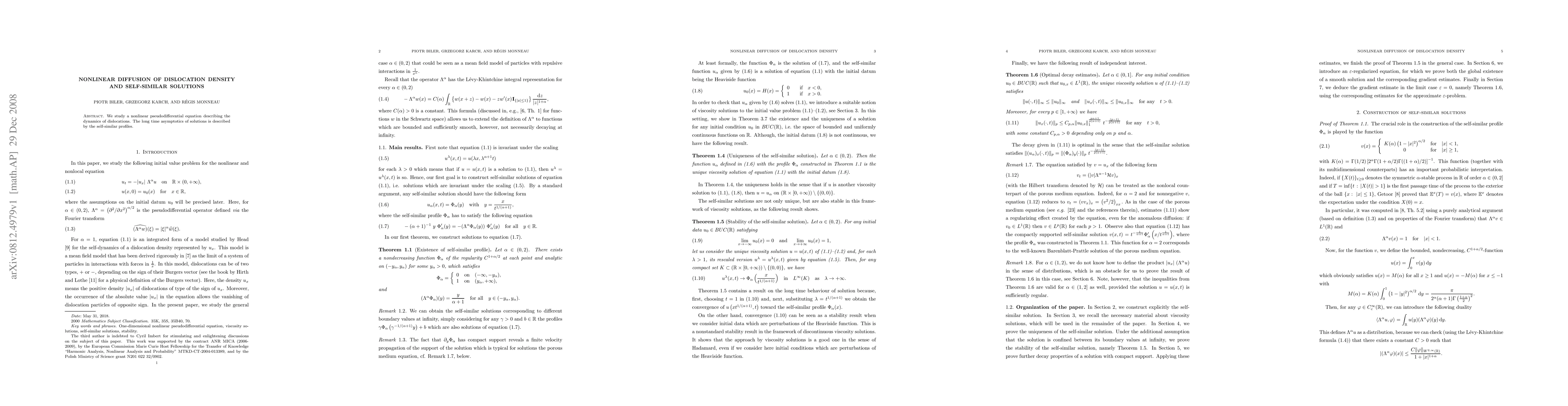 We study a nonlinear pseudodifferential equation describing the dynamics of dislocations. The long time asymptotics of solutions is described by the self-similar profiles.