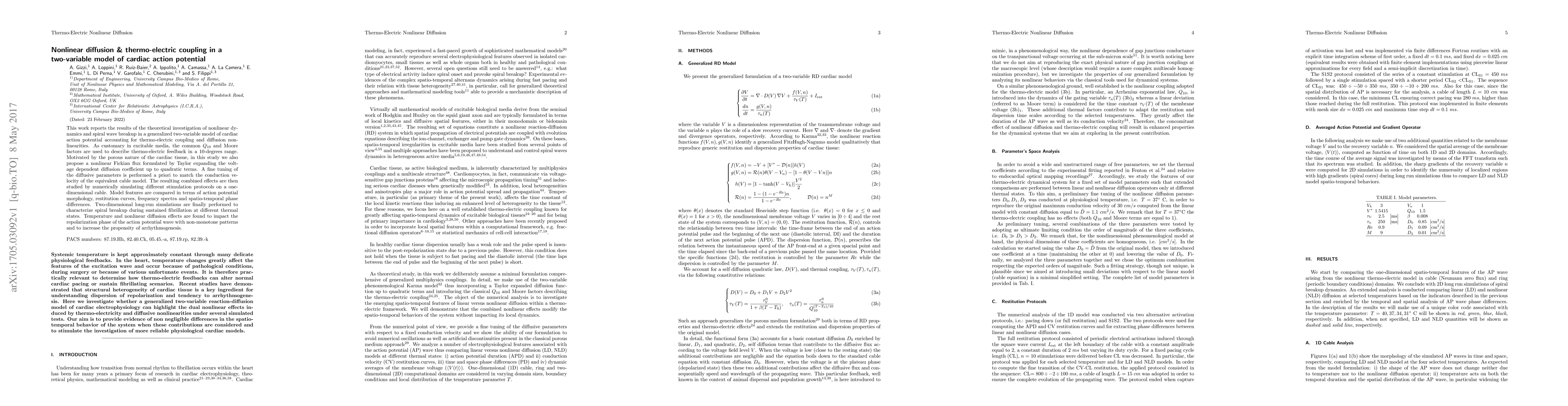 This work reports the results of the theoretical investigation of nonlinear dynamics and spiral wave breakup in a generalized two-variable model of cardiac action potential accounting for thermo-electric coupling and diffusion nonlinearities. As customary in excitable media, the common Q10 and Moore factors are used to describe thermo-electric feedback in a 10-degrees range. Motivated by the porous nature of the cardiac tissue, in this study we also propose a nonlinear Fickian flux formulated by Taylor expanding the voltage dependent diffusion coefficient up to quadratic terms. A fine tuning of the diffusive parameters is performed a priori to match the conduction velocity of the equivalent cable model. The resulting combined effects are then studied by numerically simulating different stimulation protocols on a one-dimensional cable. Model features are compared in terms of action potential morphology, restitution curves, frequency spectra and spatio-temporal phase differences. Two-dimensional long-run simulations are finally performed to characterize spiral breakup during sustained fibrillation at different thermal states. Temperature and nonlinear diffusion effects are found to impact the repolarization phase of the action potential wave with non-monotone patterns and to increase the propensity of arrhythmogenesis.