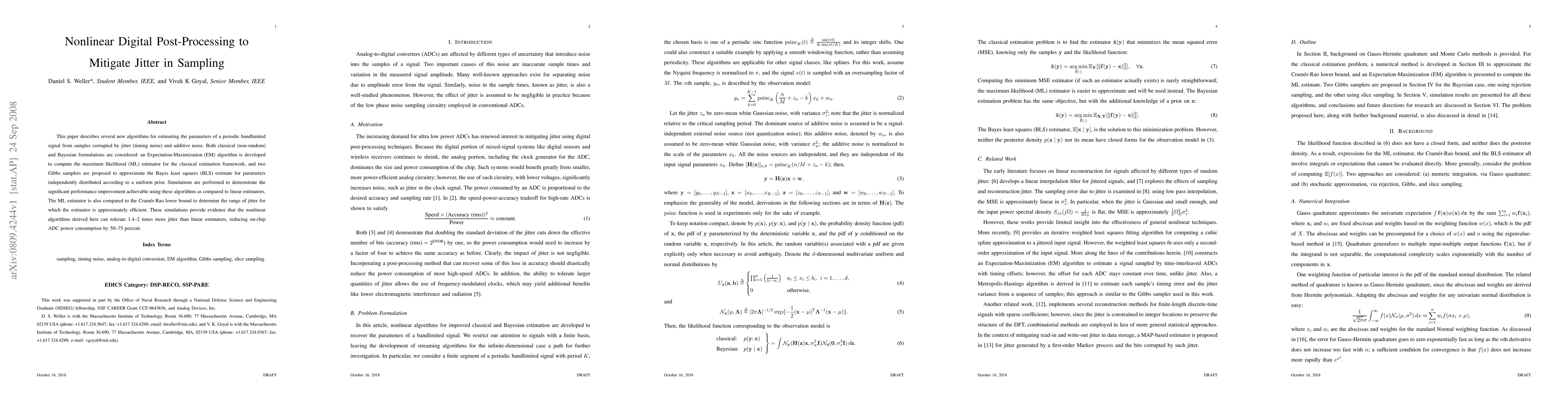 This paper describes several new algorithms for estimating the parameters of a periodic bandlimited signal from samples corrupted by jitter (timing noise) and additive noise. Both classical (non-random) and Bayesian formulations are considered: an Expectation-Maximization (EM) algorithm is developed to compute the maximum likelihood (ML) estimator for the classical estimation framework, and two Gibbs samplers are proposed to approximate the Bayes least squares (BLS) estimate for parameters independently distributed according to a uniform prior. Simulations are performed to demonstrate the significant performance improvement achievable using these algorithms as compared to linear estimators. The ML estimator is also compared to the Cramer-Rao lower bound to determine the range of jitter for which the estimator is approximately efficient. These simulations provide evidence that the nonlinear algorithms derived here can tolerate 1.4-2 times more jitter than linear estimators, reducing on-chip ADC power consumption by 50-75 percent.
