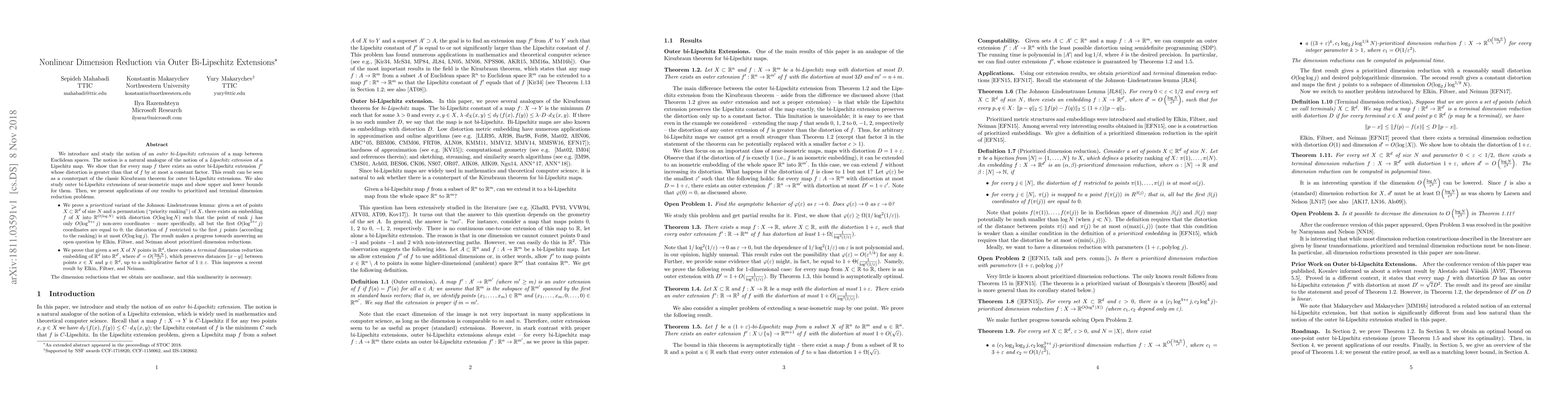 This paper introduces outer bi-Lipschitz extensions, a nonlinear analogue of Lipschitz extensions, and proves their existence with bounded distortion. It applies these extensions to achieve prioritized and terminal dimension reduction, improving upon existing results for both.