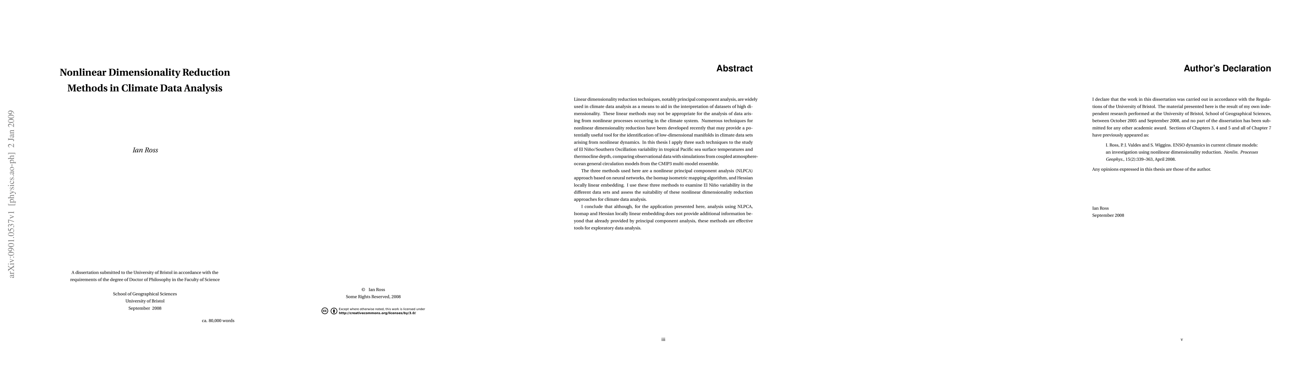 This paper explores the application of three nonlinear dimensionality reduction techniques—nonlinear principal component analysis (NLPCA), Isomap, and Hessian locally linear embedding—to analyze El Nino variability in climate data. While these methods do not offer new insights compared to linear PCA in this specific study, they are deemed effective for exploratory climate data analysis.