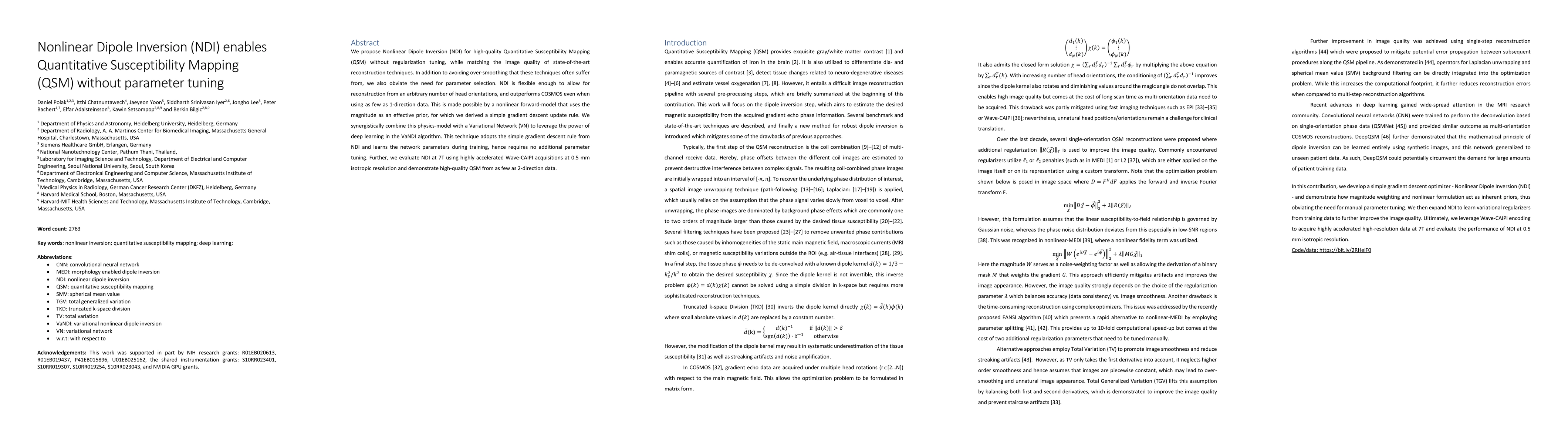Nonlinear Dipole Inversion (NDI) enables high-quality Quantitative Susceptibility Mapping (QSM) without parameter tuning or regularization, outperforming state-of-the-art techniques even with minimal data. The VaNDI algorithm combines NDI's physics-based model with a Variational Network, achieving high-quality QSM at 7T with accelerated acquisitions.
