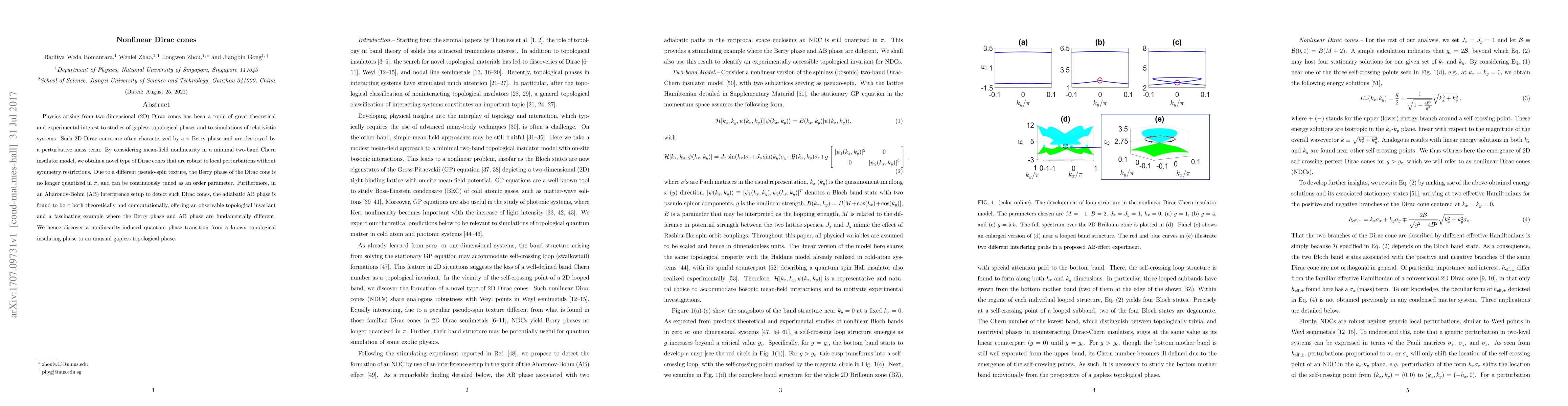 This paper investigates nonlinear Dirac cones in 2D topological phases, revealing a novel type of Dirac cones robust to perturbations, with tunable Berry phase and a unique pseudo-spin texture. It uncovers a quantum phase transition to an unusual gapless topological phase, characterized by a distinct Aharonov-Bohm phase.