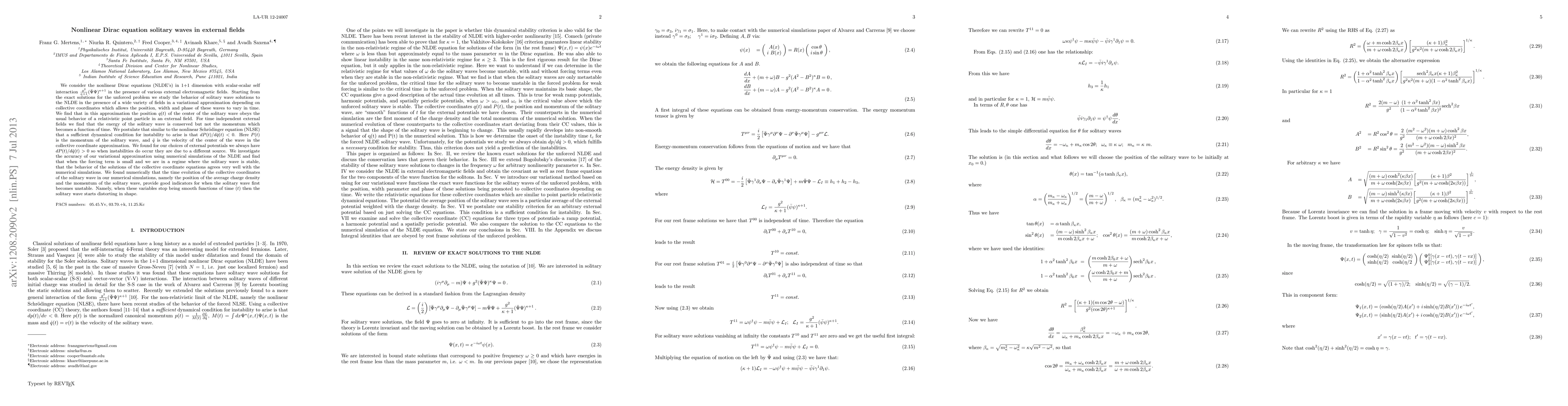 This paper studies nonlinear Dirac equations in 1+1 dimensions with self-interaction and external electromagnetic fields, finding solitary wave solutions behave like relativistic particles. The momentum of these waves is time-dependent, and instabilities arise due to factors other than the momentum gradient. The variational approximation aligns well with numerical simulations for stable solitary waves.
