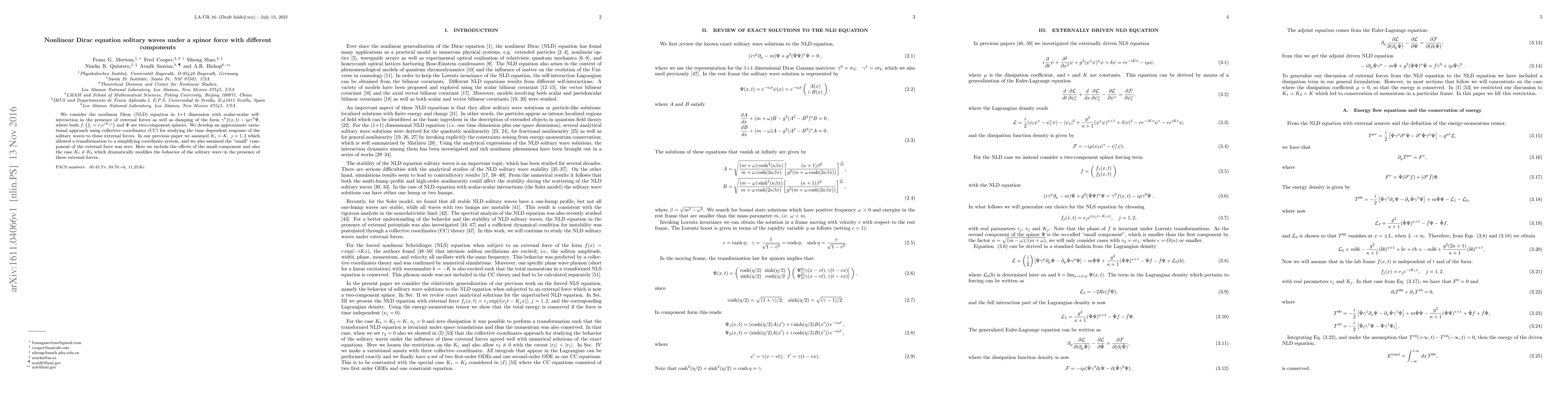 This paper investigates the nonlinear Dirac equation in 1+1 dimensions with scalar-scalar self-interaction and external forces, employing a variational approach with collective coordinates. It examines the impact of varying wave components and non-negligible small external force components on the behavior of solitary waves.
