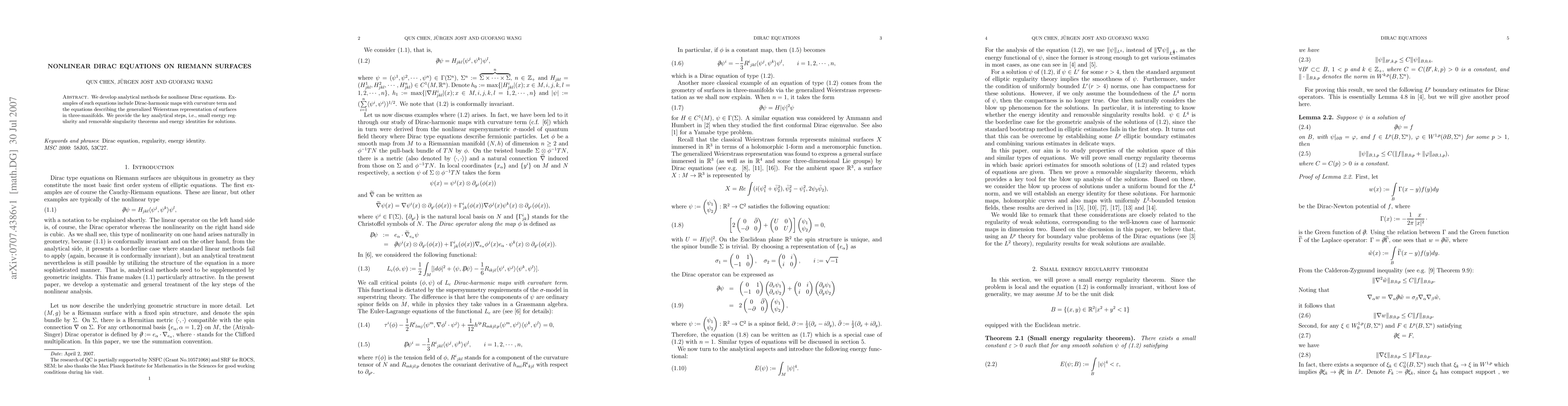 We develop analytical methods for nonlinear Dirac equations. Examples of such equations include Dirac-harmonic maps with curvature term and the equations describing the generalized Weierstrass representation of surfaces in three-manifolds. We provide the key analytical steps, i.e., small energy regularity and removable singularity theorems and energy identities for solutions.