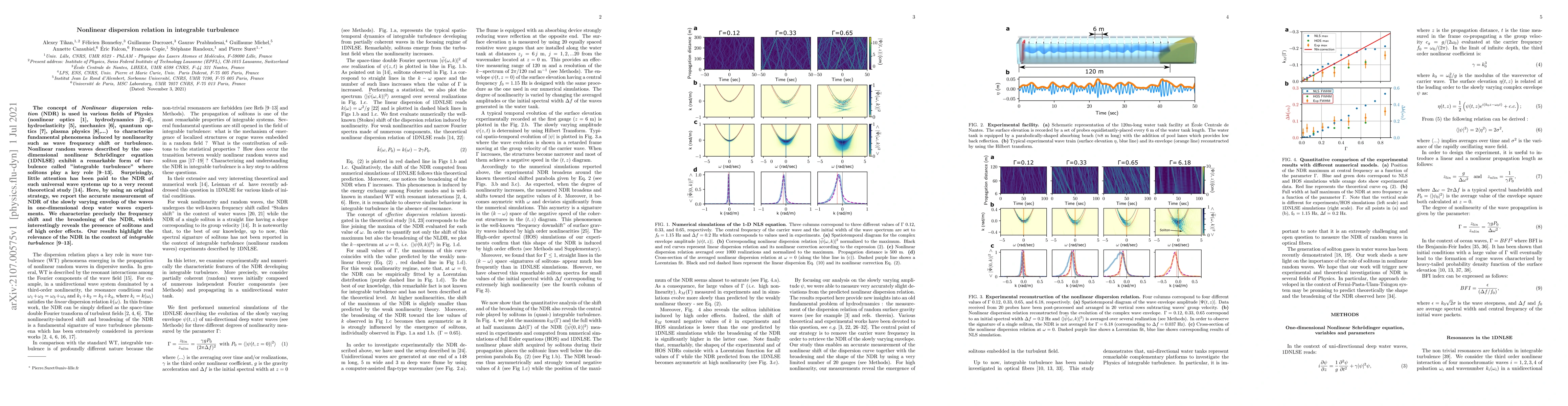 The concept of Nonlinear dispersion relation (NDR) is used in various fields of Physics (nonlinear optics, hydrodynamics, hydroelasticity, mechanics, quantum optics, plasma physics,...) to characterize fundamental phenomena induced by nonlinearity such as wave frequency shift or turbulence. Nonlinear random waves described by the onedimensional nonlinear Schrodinger equation (1DNLSE) exhibit a remarkable form of turbulence called "integrable turbulence" where solitons play a key role. Surprisingly, little attention has been paid to the NDR of such universal wave systems up to a very recent theoretical study. Here, by using an original strategy, we report the accurate measurement of NDR of the slowly varying envelop of the waves in one-dimensional deep water waves experiments. We characterize precisely the frequency shift and the broadening of the NDR, which interestingly reveals the presence of solitons and of high order effects. Our results highlight the relevance of the NDR in the context of integrable turbulence.