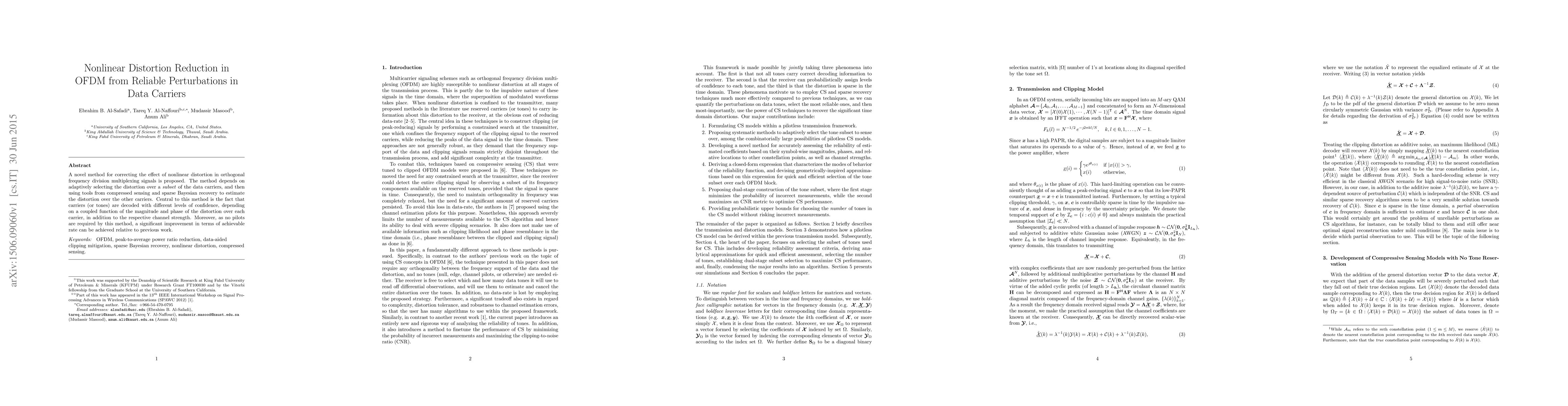 A novel method for correcting the effect of nonlinear distortion in orthogonal frequency division multiplexing signals is proposed. The method depends on adaptively selecting the distortion over a subset of the data carriers, and then using tools from compressed sensing and sparse Bayesian recovery to estimate the distortion over the other carriers. Central to this method is the fact that carriers (or tones) are decoded with different levels of confidence, depending on a coupled function of the magnitude and phase of the distortion over each carrier, in addition to the respective channel strength. Moreover, as no pilots are required by this method, a significant improvement in terms of achievable rate can be achieved relative to previous work.