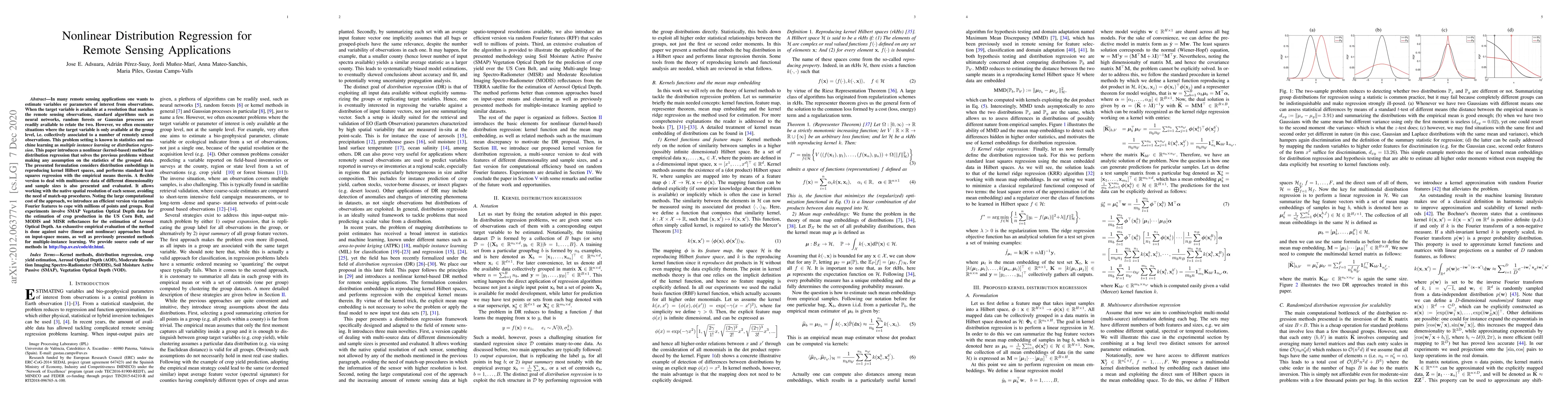 In many remote sensing applications one wants to estimate variables or parameters of interest from observations. When the target variable is available at a resolution that matches the remote sensing observations, standard algorithms such as neural networks, random forests or Gaussian processes are readily available to relate the two. However, we often encounter situations where the target variable is only available at the group level, i.e. collectively associated to a number of remotely sensed observations. This problem setting is known in statistics and machine learning as {\em multiple instance learning} or {\em distribution regression}. This paper introduces a nonlinear (kernel-based) method for distribution regression that solves the previous problems without making any assumption on the statistics of the grouped data. The presented formulation considers distribution embeddings in reproducing kernel Hilbert spaces, and performs standard least squares regression with the empirical means therein. A flexible version to deal with multisource data of different dimensionality and sample sizes is also presented and evaluated. It allows working with the native spatial resolution of each sensor, avoiding the need of match-up procedures. Noting the large computational cost of the approach, we introduce an efficient version via random Fourier features to cope with millions of points and groups.