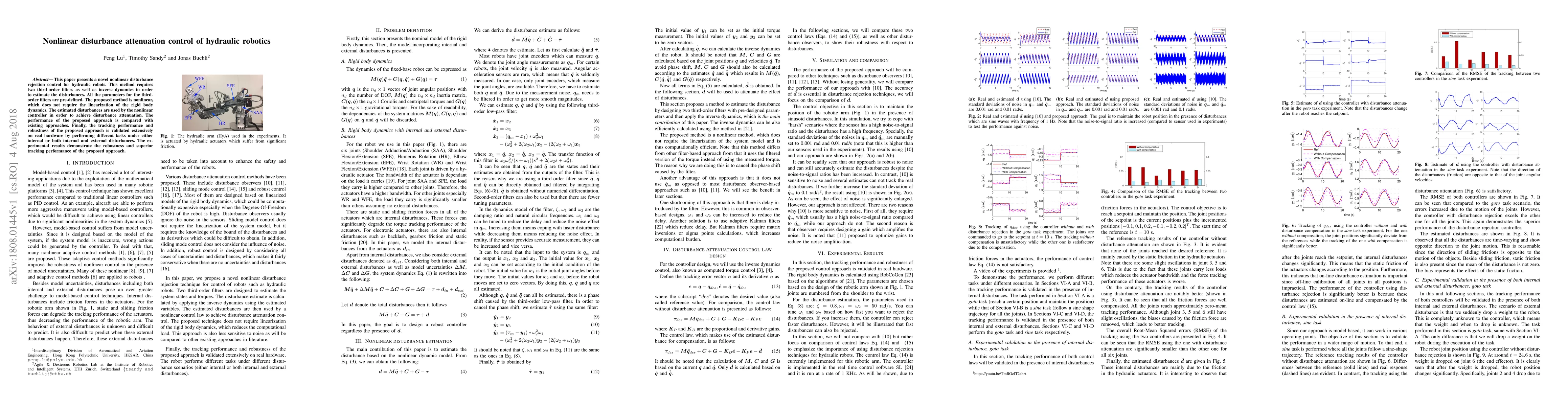 This paper presents a novel nonlinear disturbance rejection control for hydraulic robots. This method requires two third-order filters as well as inverse dynamics in order to estimate the disturbances. All the parameters for the third-order filters are pre-defined. The proposed method is nonlinear, which does not require the linearization of the rigid body dynamics. The estimated disturbances are used by the nonlinear controller in order to achieve disturbance attenuation. The performance of the proposed approach is compared with existing approaches. Finally, the tracking performance and robustness of the proposed approach is validated extensively on real hardware by performing different tasks under either internal or both internal and external disturbances. The experimental results demonstrate the robustness and superior tracking performance of the proposed approach.