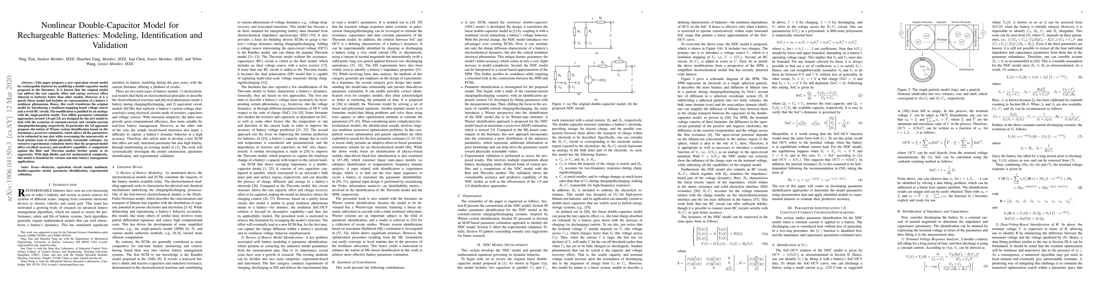 This paper proposes a new equivalent circuit model for rechargeable batteries by modifying a double-capacitor model proposed in [1]. It is known that the original model can address the rate capacity effect and energy recovery effect inherent to batteries better than other models. However, it is a purely linear model and includes no representation of a battery's nonlinear phenomena. Hence, this work transforms the original model by introducing a nonlinear-mapping-based voltage source and a serial RC circuit. The modification is justified by an analogy with the single-particle model. Two parameter estimation approaches, termed 1.0 and 2.0, are designed for the new model to deal with the scenarios of constant-current and variable-current charging/discharging, respectively. In particular, the 2.0 approach proposes the notion of Wiener system identification based on maximum a posteriori estimation, which allows all the parameters to be estimated in one shot while overcoming the nonconvexity or local minima issue to obtain physically reasonable estimates. An extensive experimental evaluation shows that the proposed model offers excellent accuracy and predictive capability. A comparison against the Rint and Thevenin models further points to its superiority. With high fidelity and low mathematical complexity, this model is beneficial for various real-time battery management applications.