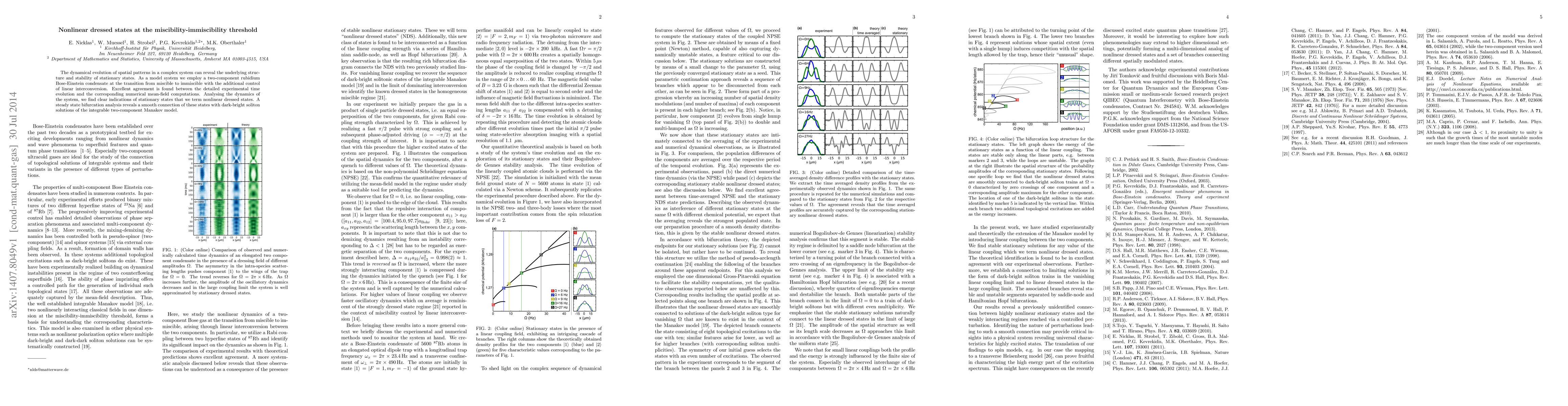 The dynamical evolution of spatial patterns in a complex system can reveal the underlying structure and stability of stationary states. As a model system we employ a two-component rubidium Bose-Einstein condensate at the transition from miscible to immiscible with the additional control of linear interconversion. Excellent agreement is found between the detailed experimental time evolution and the corresponding numerical mean-field computations. Analyzing the dynamics of the system, we find clear indications of stationary states that we term nonlinear dressed states. A steady state bifurcation analysis reveals a smooth connection of these states with dark-bright soliton solutions of the integrable two-component Manakov model.