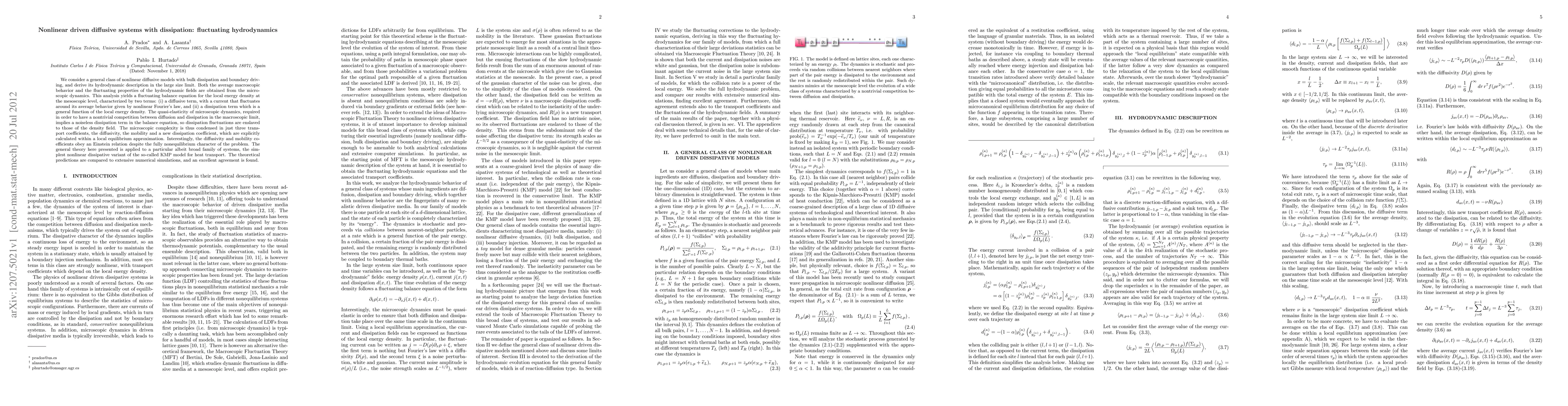 This paper develops a hydrodynamic description for nonlinear diffusive systems with dissipation and boundary driving, deriving a fluctuating balance equation for local energy density. It reveals that dissipation fluctuations are tied to density field fluctuations, condensing microscopic complexity into three transport coefficients, and validates the theory with numerical simulations.