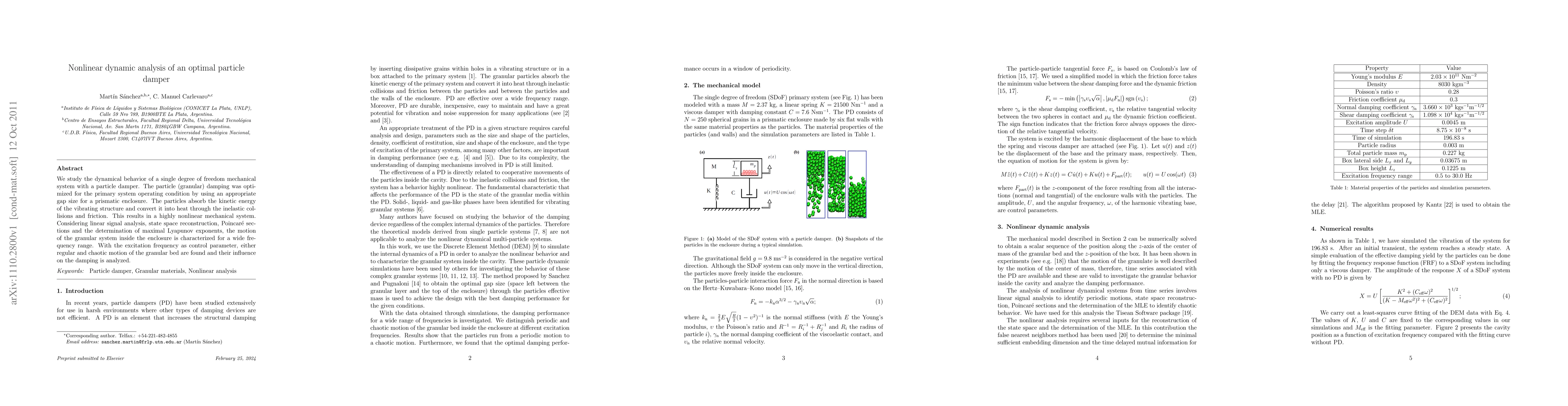 We study the dynamical behavior of a single degree of freedom mechanical system with a particle damper. The particle (granular) damping was optimized for the primary system operating condition by using an appropriate gap size for a prismatic enclosure. The particles absorb the kinetic energy of the vibrating structure and convert it into heat through the inelastic collisions and friction. This results in a highly nonlinear mechanical system. Considering linear signal analysis, state space reconstruction, Poincar\'e sections and the determination of maximal Lyapunov exponents, the motion of the granular system inside the enclosure is characterized for a wide frequency range. With the excitation frequency as control parameter, either regular and chaotic motion of the granular bed are found and their influence on the damping is analyzed.