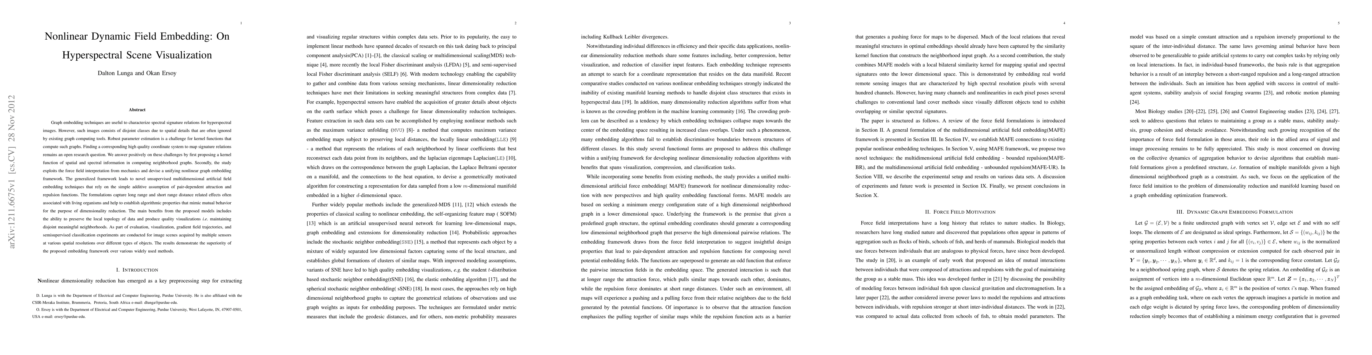 Graph embedding techniques are useful to characterize spectral signature relations for hyperspectral images. However, such images consists of disjoint classes due to spatial details that are often ignored by existing graph computing tools. Robust parameter estimation is a challenge for kernel functions that compute such graphs. Finding a corresponding high quality coordinate system to map signature relations remains an open research question. We answer positively on these challenges by first proposing a kernel function of spatial and spectral information in computing neighborhood graphs. Secondly, the study exploits the force field interpretation from mechanics and devise a unifying nonlinear graph embedding framework. The generalized framework leads to novel unsupervised multidimensional artificial field embedding techniques that rely on the simple additive assumption of pair-dependent attraction and repulsion functions. The formulations capture long range and short range distance related effects often associated with living organisms and help to establish algorithmic properties that mimic mutual behavior for the purpose of dimensionality reduction. The main benefits from the proposed models includes the ability to preserve the local topology of data and produce quality visualizations i.e. maintaining disjoint meaningful neighborhoods. As part of evaluation, visualization, gradient field trajectories, and semisupervised classification experiments are conducted for image scenes acquired by multiple sensors at various spatial resolutions over different types of objects. The results demonstrate the superiority of the proposed embedding framework over various widely used methods.