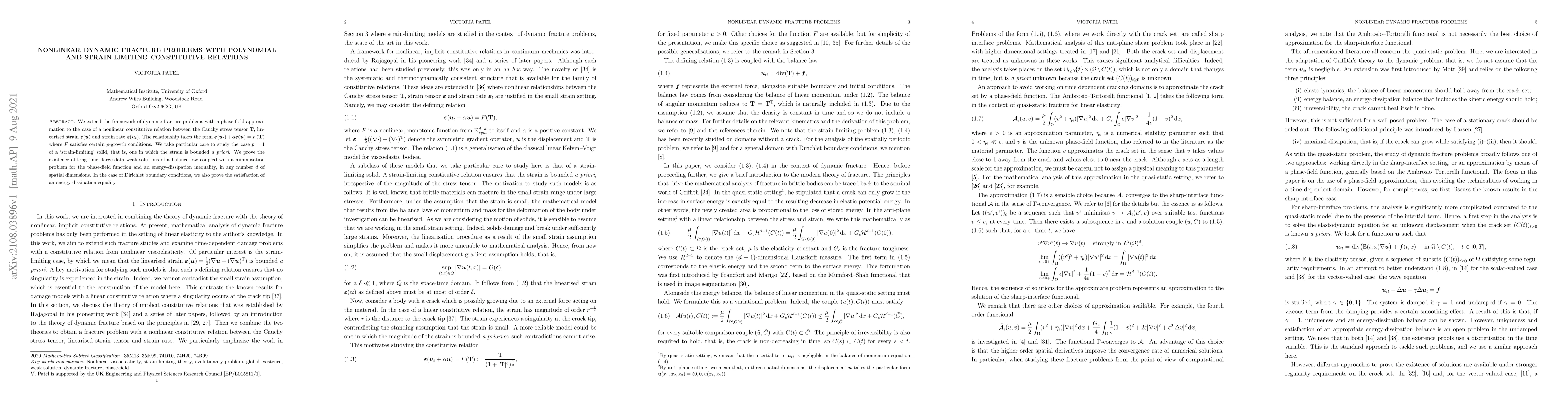 We extend the framework of dynamic fracture problems with a phase-field approximation to the case of a nonlinear constitutive relation between the Cauchy stress tensor $ \mathbb{T} $, linearised strain $ \boldsymbol{\epsilon}(\mathbf{u}) $ and strain rate $ \boldsymbol{\epsilon}(\mathbf{u}_t ) $. The relationship takes the form $ \boldsymbol{\epsilon}(\mathbf{u}_t) + \alpha\boldsymbol{\epsilon}(\mathbf{u}) = F(\mathbb{T}) $ where $ F $ satisfies certain $p$-growth conditions. We take particular care to study the case $p=1$ of a `strain-limiting' solid, that is, one in which the strain is bounded {\it a priori}. We prove the existence of long-time, large-data weak solutions of a balance law coupled with a minimisation problem for the phase-field function and an energy-dissipation inequality, in any number $ d$ of spatial dimensions. In the case of Dirichlet boundary conditions, we also prove the satisfaction of an energy-dissipation equality.