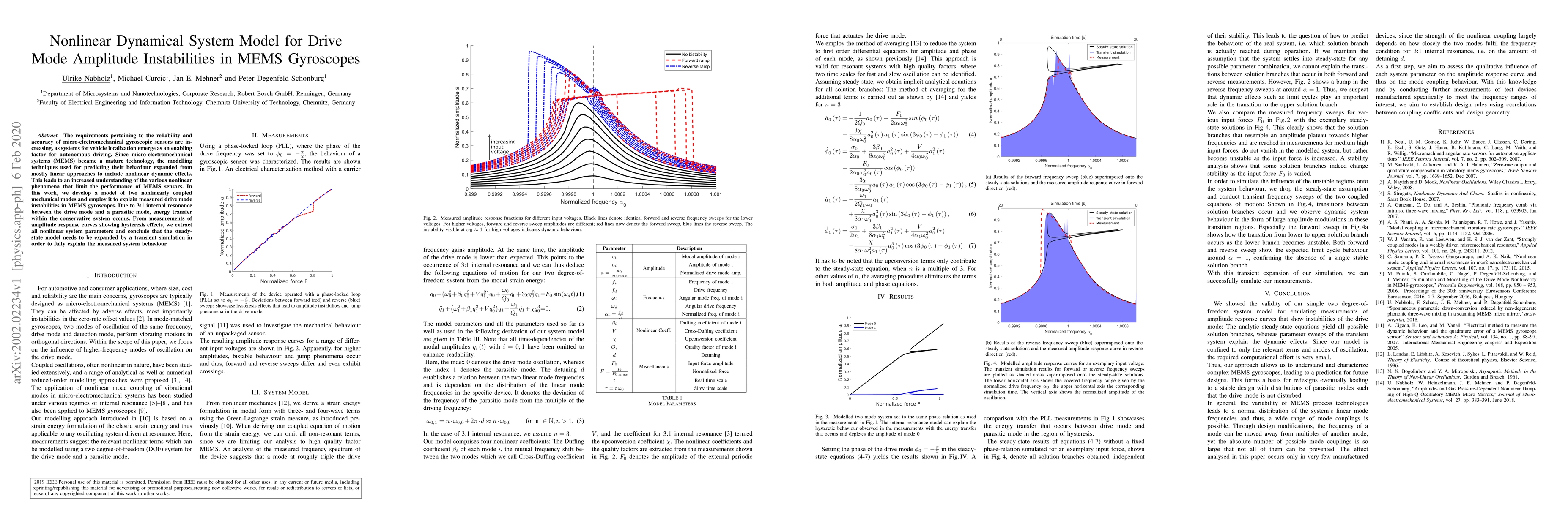 This paper develops a nonlinear dynamical system model to explain amplitude instabilities in MEMS gyroscopes, focusing on the 3:1 internal resonance causing energy transfer between drive and parasitic modes. The model's parameters are extracted from amplitude response curves, revealing the need for transient simulations to fully capture the observed hysteresis effects.