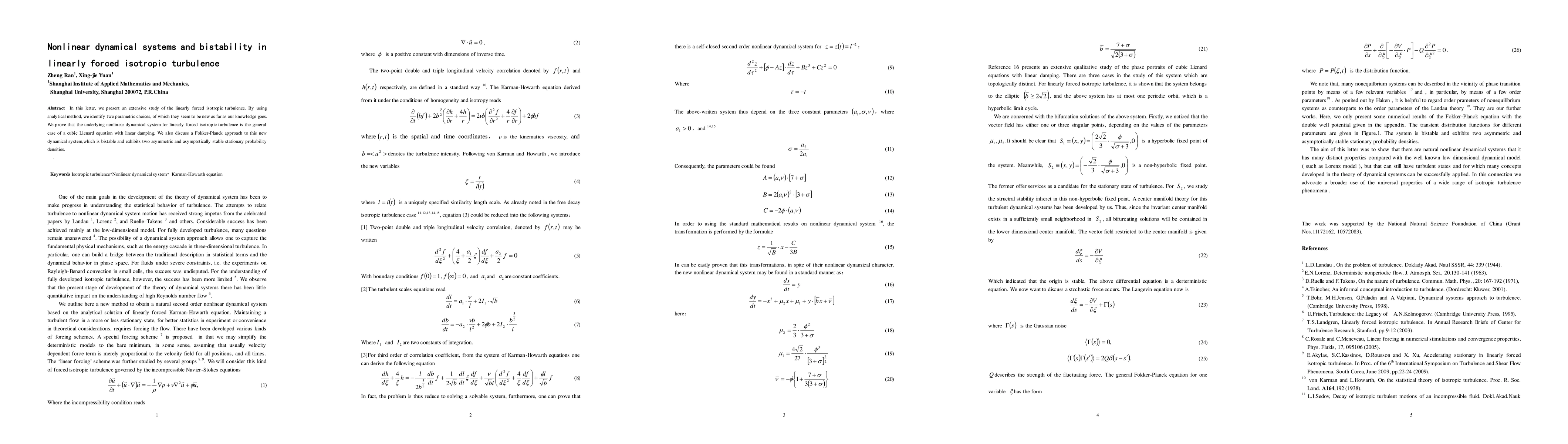 In this letter, we present an extensive study of the linearly forced isotropic turbulence. By using analytical method, we identify two parametric choices, of which they seem to be new as far as our knowledge goes. We prove that the underlying nonlinear dynamical system for linearly forced isotropic turbulence is the general case of a cubic Lienard equation with linear damping. We also discuss a Fokker-Planck approach to this new dynamical system,which is bistable and exhibits two asymmetric and asymptotically stable stationary probability densities.