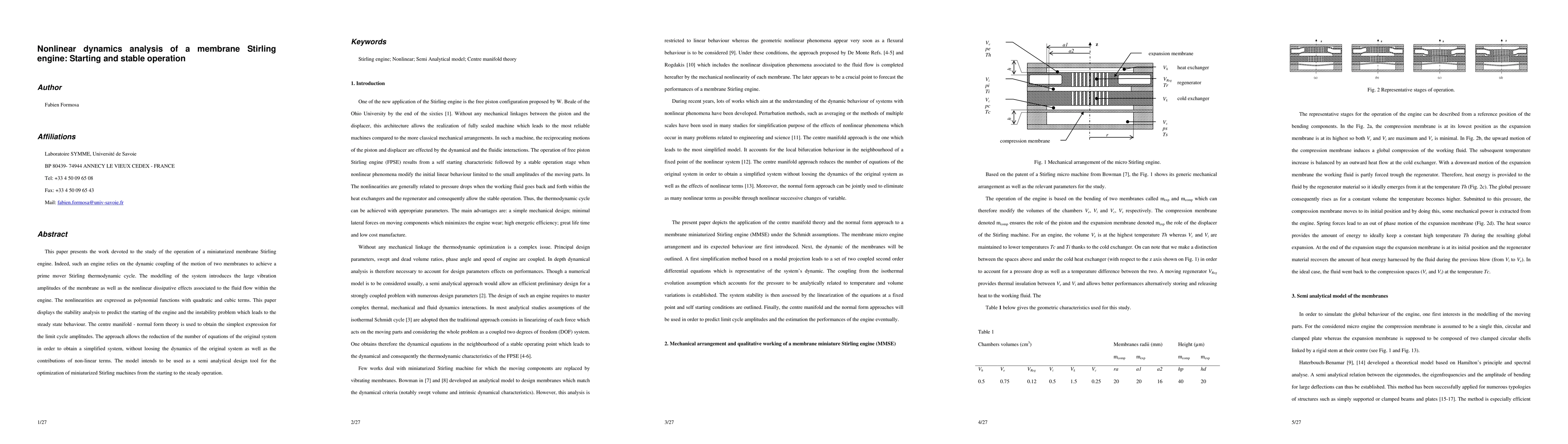This paper investigates the nonlinear dynamics of a miniaturized membrane Stirling engine, focusing on its starting and stable operation. It employs centre manifold theory to simplify the system, predicting engine start and steady-state behavior while capturing nonlinear effects.