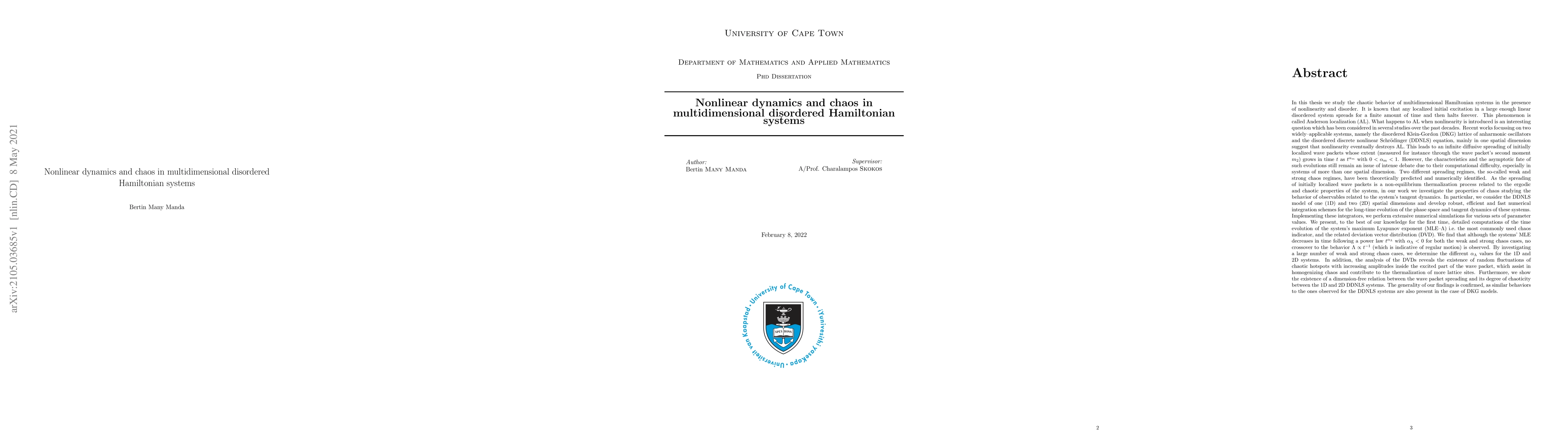 This paper investigates the chaotic dynamics in multidimensional disordered Hamiltonian systems with nonlinearity, focusing on the Anderson localization phenomenon. It finds that while the maximum Lyapunov exponent decreases over time, no transition to regular motion occurs, and chaotic hotspots within wave packets contribute to thermalization.