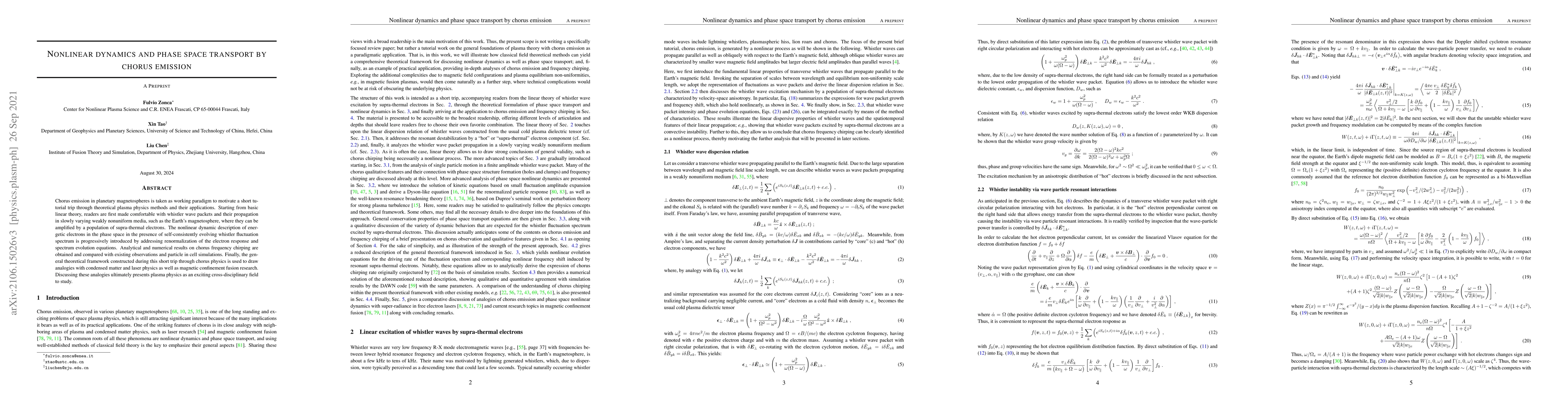 Chorus emission in planetary magnetospheres is taken as working paradigm to motivate a short tutorial trip through theoretical plasma physics methods and their applications. Starting from basic linear theory, readers are first made comfortable with whistler wave packets and their propagation in slowly varying weakly nonuniform media, such as the Earth's magnetosphere, where they can be amplified by a population of supra-thermal electrons. The nonlinear dynamic description of energetic electrons in the phase space in the presence of self-consistently evolving whistler fluctuation spectrum is progressively introduced by addressing renormalization of the electron response and spectrum evolution equations. Analytical and numerical results on chorus frequency chirping are obtained and compared with existing observations and particle in cell simulations. Finally, the general theoretical framework constructed during this short trip through chorus physics is used to draw analogies with condensed matter and laser physics as well as magnetic confinement fusion research. Discussing these analogies ultimately presents plasma physics as an exciting cross-disciplinary field to study.