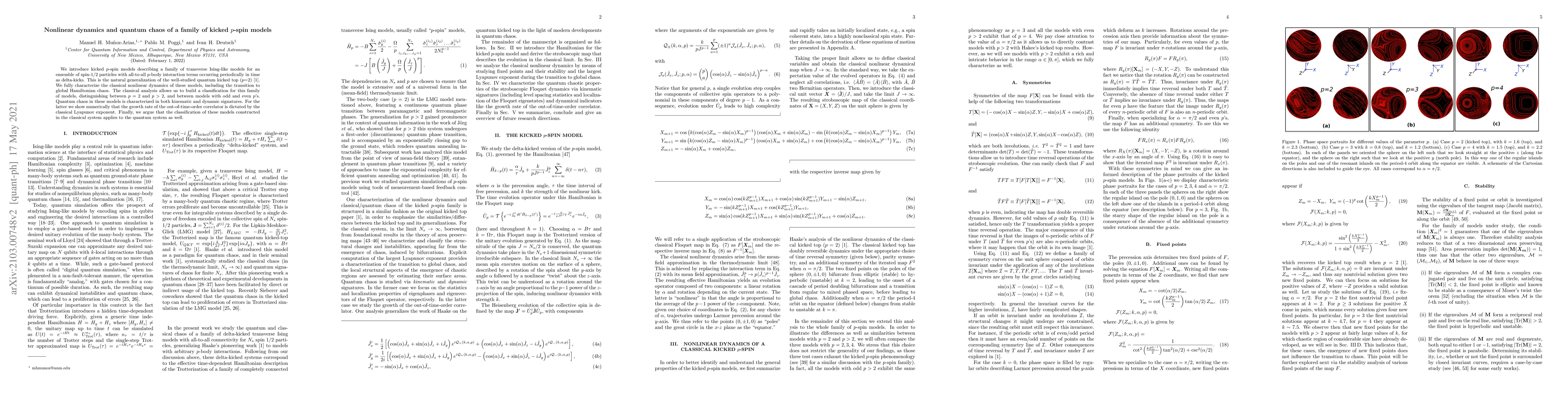 This paper introduces a family of kicked $p$-spin models, generalizing the quantum kicked top, and characterizes their classical nonlinear dynamics, including chaos. It also investigates quantum chaos, showing that the growth rate of out-of-time-order correlators is linked to the classical Lyapunov exponent, and argues that the classical classification applies to the quantum system.