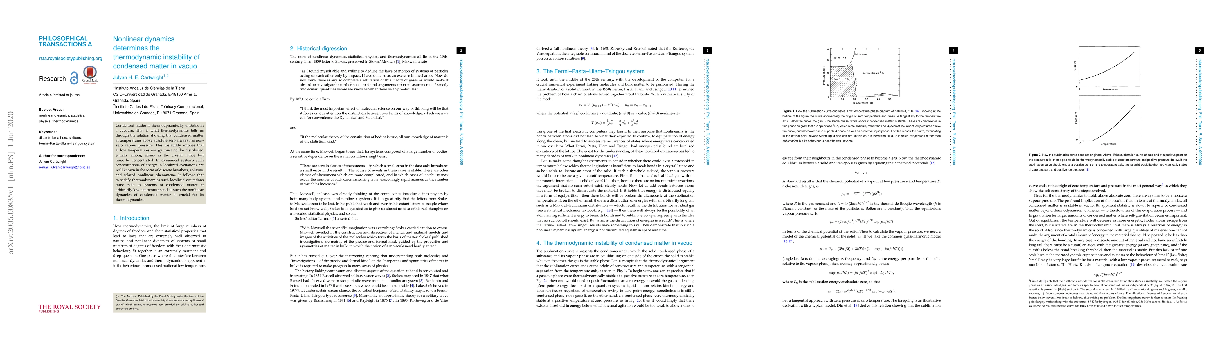 Condensed matter is thermodynamically unstable in a vacuum. That is what thermodynamics tells us through the relation showing that condensed matter at temperatures above absolute zero always has non-zero vapour pressure. This instability implies that at low temperatures energy must not be distributed equally among atoms in the crystal lattice but must be concentrated. In dynamical systems such concentrations of energy in localized excitations are well known in the form of discrete breathers, solitons, and related nonlinear phenomena. It follows that to satisfy thermodynamics such localized excitations must exist in systems of condensed matter at arbitrarily low temperature and as such the nonlinear dynamics of condensed matter is crucial for its thermodynamics.