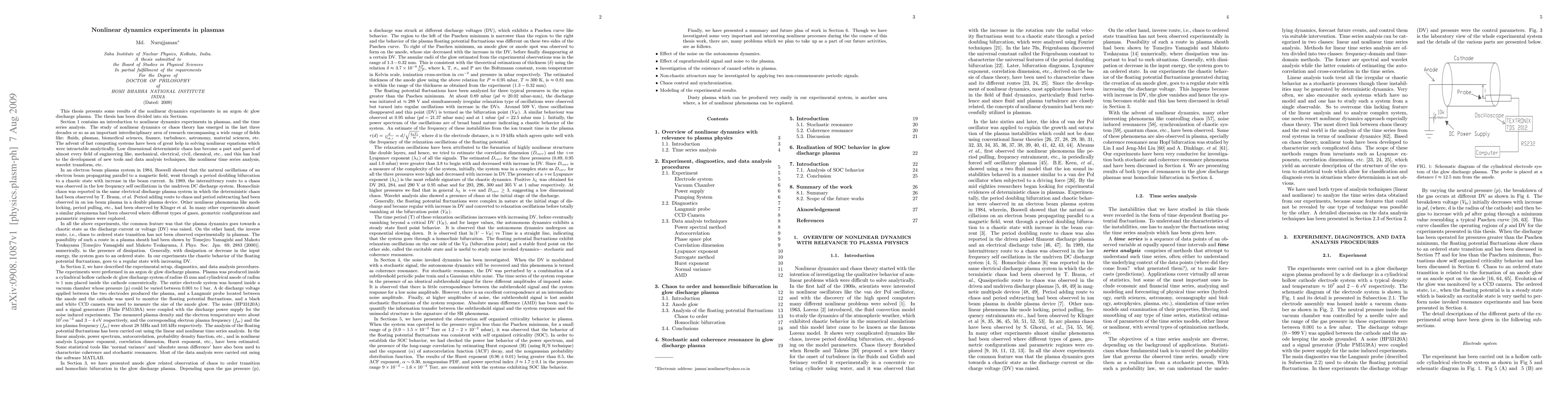 The study of nonlinear dynamics or chaos theory has emerged in the last three decades or so as an important interdisciplinary area of research encompassing a wide range of fields like: fluids, plasmas, biomedical sciences, finance, turbulence, astronomy, material sciences, etc. In plasma chaos was first experimentally observed by Boswell. Different other nonlinear dynamics related phenomena like, the intermittency route to a chaos, Homoclinic chaos, Period adding route to chaos and period subtracting, mode locking, period pulling, etc., had been observed by several researchers. In this thesis, we have presented (a) anode glow related observation of chaos to order transition and homoclinic bifurcation; (b) coherence resonance and stochastic resonance; and self organized criticality behavior in glow discharge plasma.