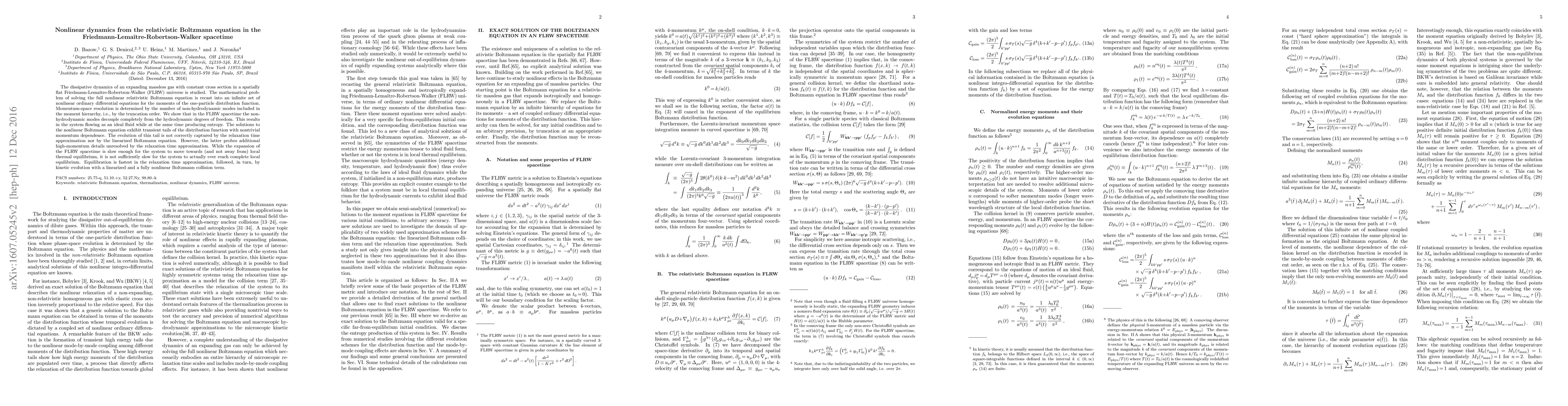 This paper investigates the dissipative dynamics of an expanding massless gas in a FLRW universe, solving the nonlinear relativistic Boltzmann equation through a moment hierarchy. The study reveals that non-hydrodynamic modes decouple from hydrodynamic degrees, leading to entropy production while the system behaves like an ideal fluid. The full nonlinear Boltzmann equation captures transient tails in the distribution function not addressed by the relaxation time approximation or linearized equation.