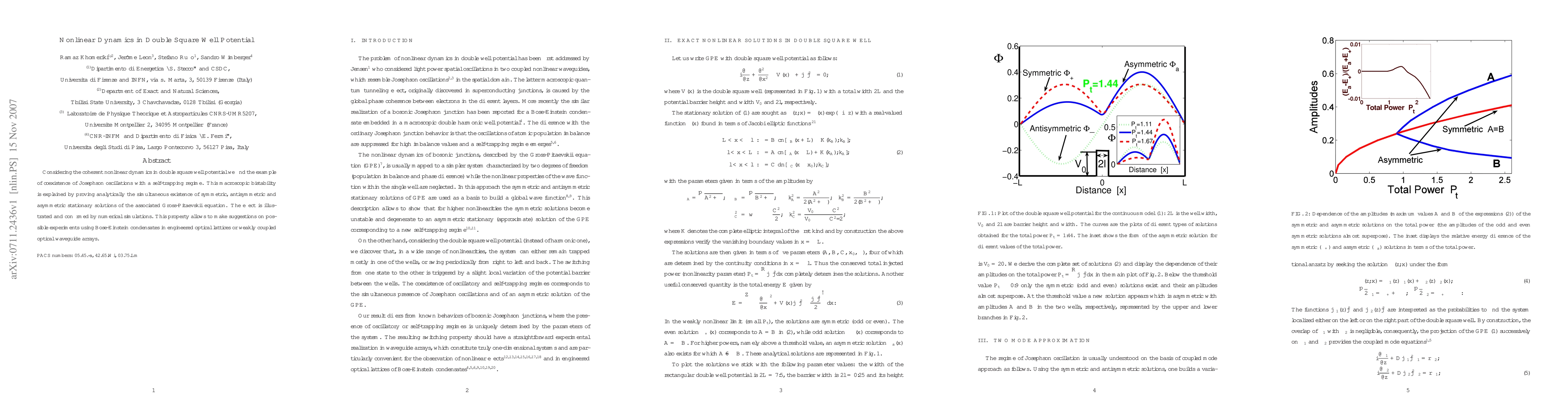 This paper investigates nonlinear dynamics in a double square well potential, revealing coexistence of Josephson oscillations and self-trapping through analytical proofs and numerical simulations. The study suggests potential experimental applications using Bose-Einstein condensates in optical lattices or waveguide arrays.