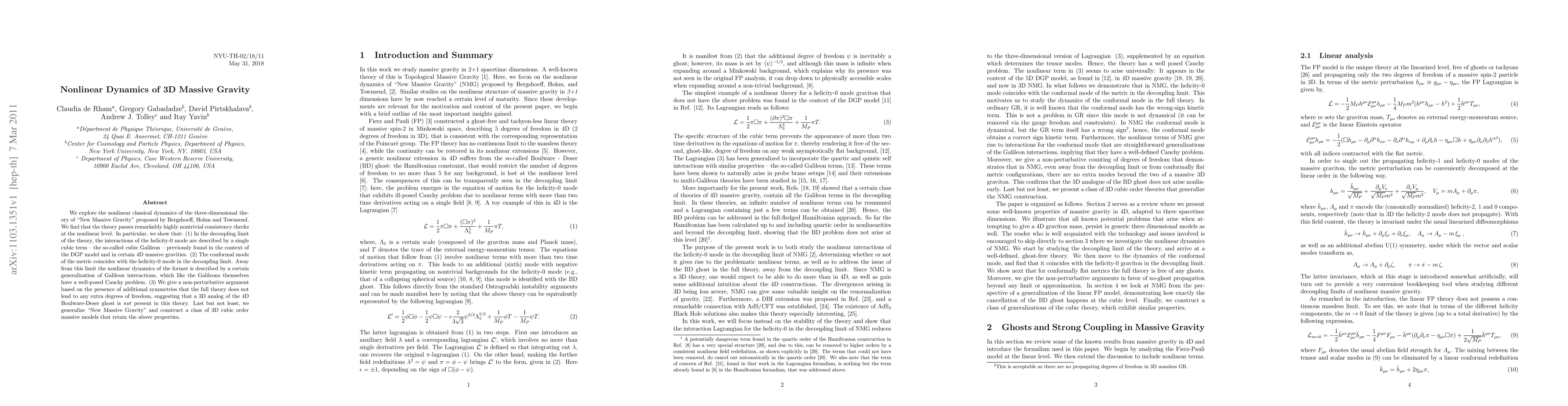 We explore the nonlinear classical dynamics of the three-dimensional theory of "New Massive Gravity" proposed by Bergshoeff, Hohm and Townsend. We find that the theory passes remarkably highly nontrivial consistency checks at the nonlinear level. In particular, we show that: (1) In the decoupling limit of the theory, the interactions of the helicity-0 mode are described by a single cubic term -- the so-called cubic Galileon -- previously found in the context of the DGP model and in certain 4D massive gravities. (2) The conformal mode of the metric coincides with the helicity-0 mode in the decoupling limit. Away from this limit the nonlinear dynamics of the former is described by a certain generalization of Galileon interactions, which like the Galileons themselves have a well-posed Cauchy problem. (3) We give a non-perturbative argument based on the presence of additional symmetries that the full theory does not lead to any extra degrees of freedom, suggesting that a 3D analog of the 4D Boulware-Deser ghost is not present in this theory. Last but not least, we generalize "New Massive Gravity" and construct a class of 3D cubic order massive models that retain the above properties.