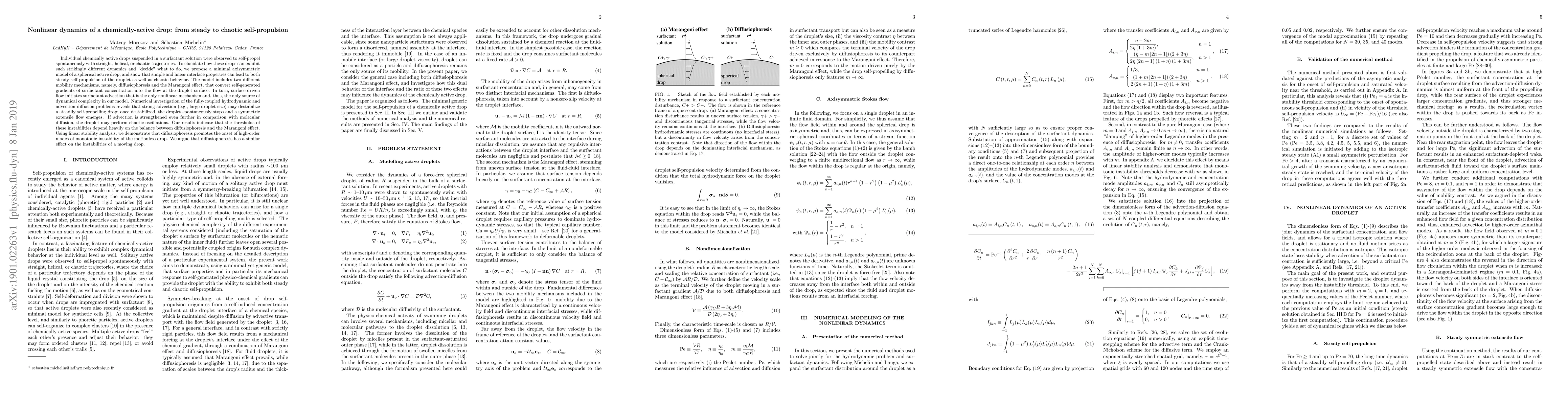 This paper explores the nonlinear dynamics of chemically active drops in surfactant solutions, showing that simple linear interface properties can lead to varied self-propulsion behaviors, including steady, helical, or chaotic trajectories. The study reveals that advection-driven instabilities, influenced by the balance between diffusiophoresis and the Marangoni effect, can cause transitions from steady to chaotic motion.