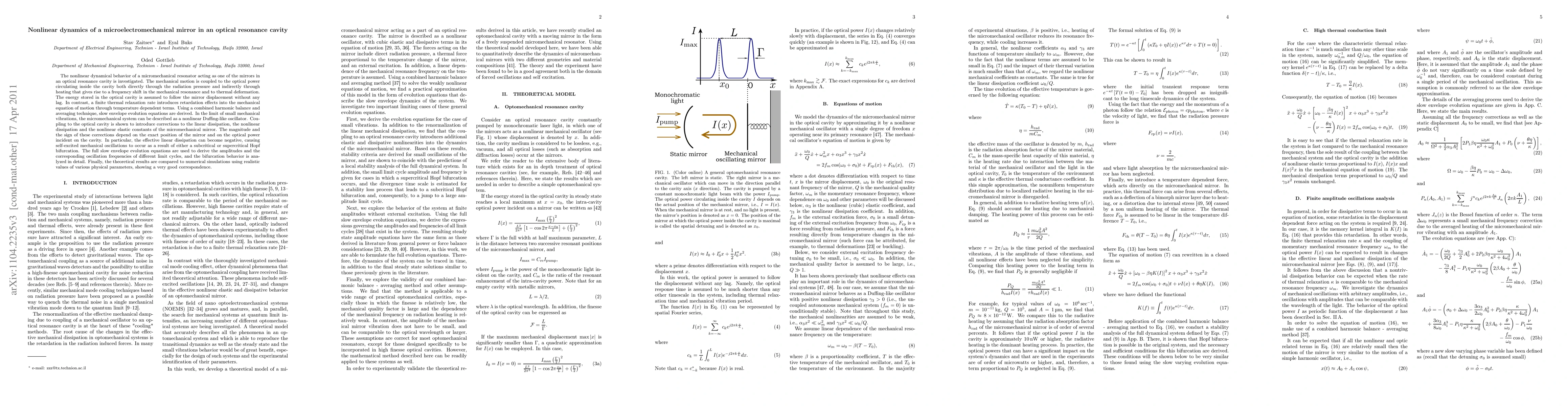 This paper investigates the nonlinear dynamics of a microelectromechanical mirror in an optical resonance cavity, revealing how mechanical motion couples with the optical power through radiation pressure and thermal effects. Theoretical models predict corrections to dissipation and elastic constants, with potential for self-sustained oscillations, validated by numerical simulations.