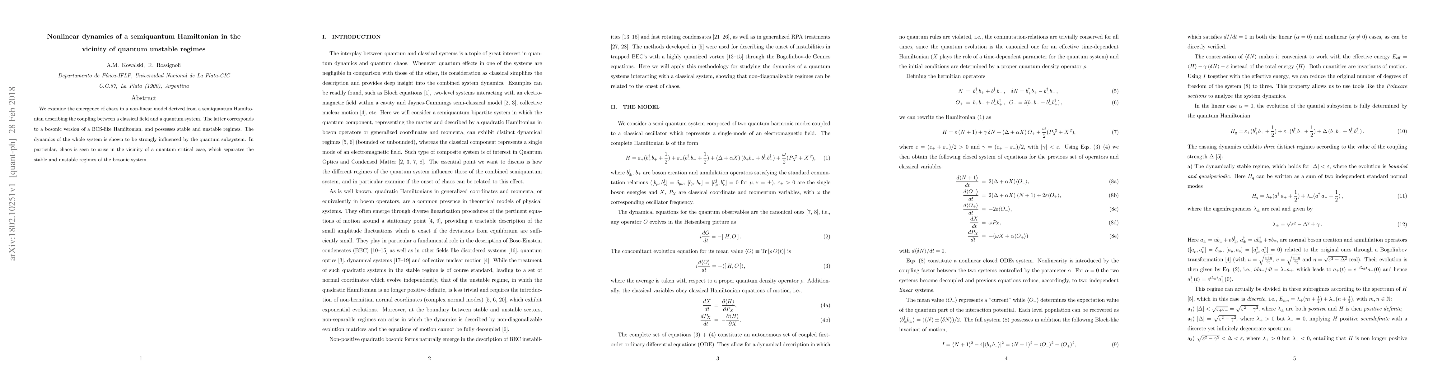 We examine the emergence of chaos in a non-linear model derived from a semiquantum Hamiltonian describing the coupling between a classical field and a quantum system. The latter corresponds to a bosonic version of a BCS-like Hamiltonian, and possesses stable and unstable regimes. The dynamics of the whole system is shown to be strongly influenced by the quantum subsystem. In particular, chaos is seen to arise in the vicinity of a quantum critical case, which separates the stable and unstable regimes of the bosonic system.