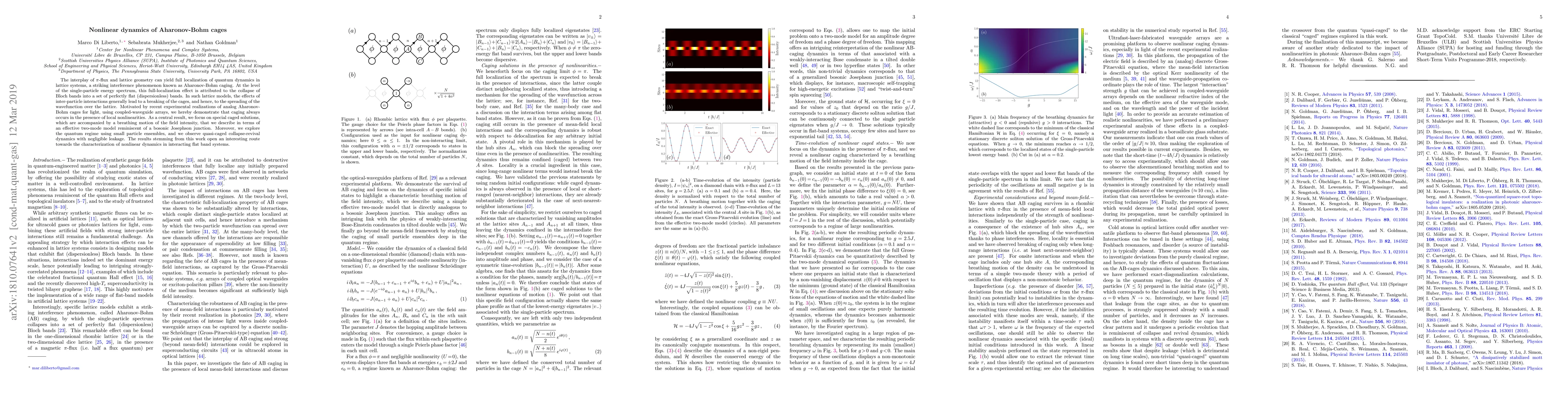 This paper investigates the effects of $\pi$-flux and lattice geometry on quantum dynamics, leading to the phenomenon of Aharonov-Bohm caging, where quantum states become fully localized. It demonstrates that local nonlinearities maintain caging effects, even in the presence of inter-particle interactions, revealing breathing dynamics and quasi-caged collapse-revival behavior in small particle ensembles.