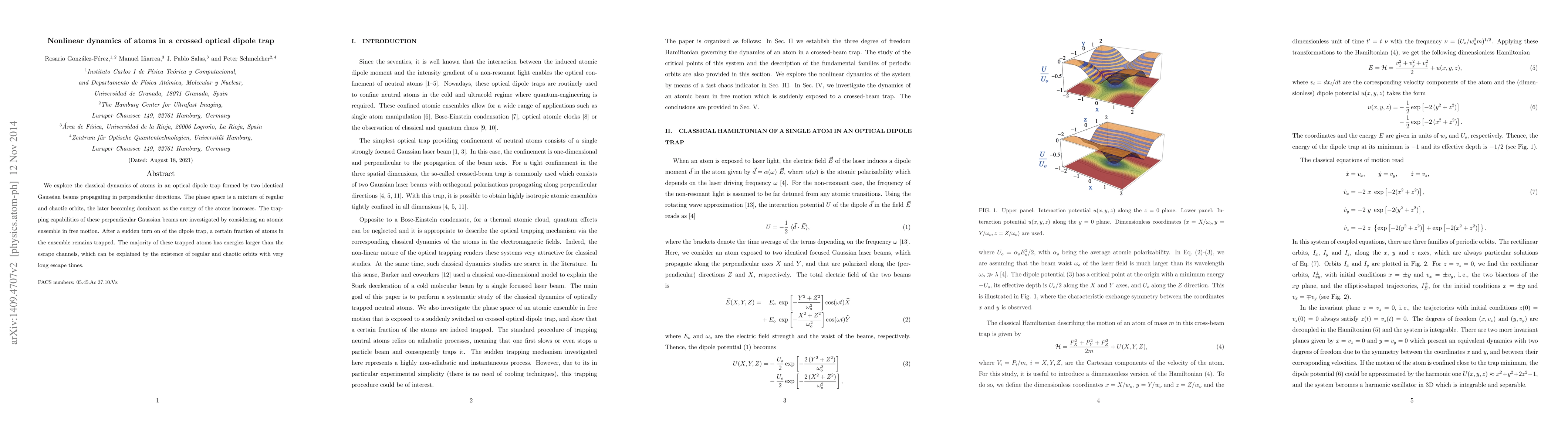 We explore the classical dynamics of atoms in an optical dipole trap formed by two identical Gaussian beams propagating in perpendicular directions. The phase space is a mixture of regular and chaotic orbits, the later becoming dominant as the energy of the atoms increases. The trapping capabilities of these perpendicular Gaussian beams are investigated by considering an atomic ensemble in free motion. After a sudden turn on of the dipole trap, a certain fraction of atoms in the ensemble remains trapped. The majority of these trapped atoms has energies larger than the escape channels, which can be explained by the existence of regular and chaotic orbits with very long escape times.