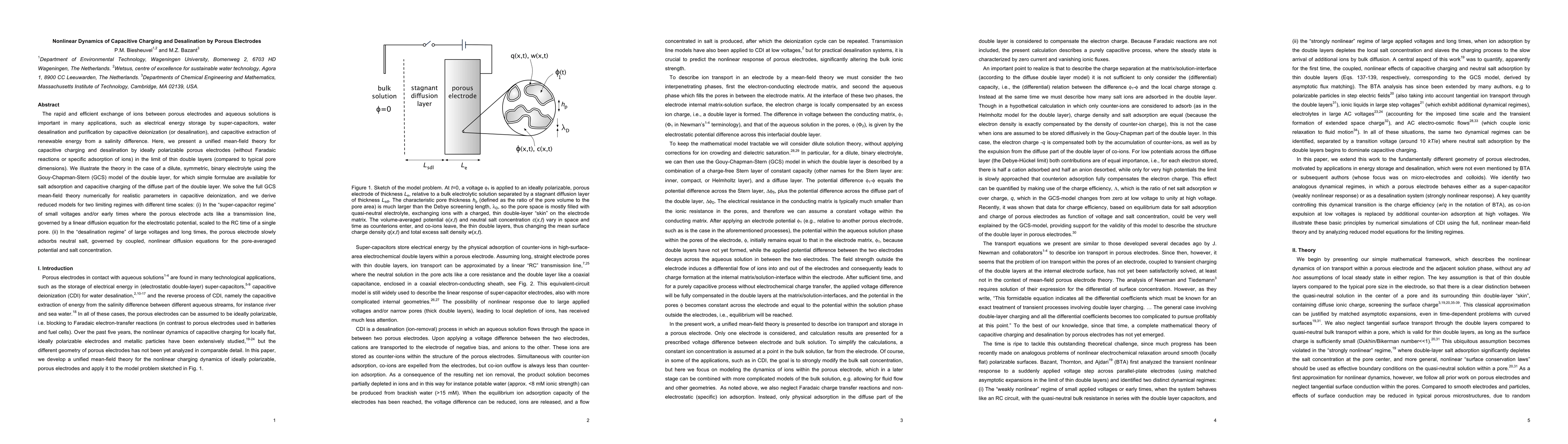 This paper presents a unified mean-field theory for capacitive charging and desalination by porous electrodes, focusing on thin double layers. It numerically solves the Gouy-Chapman-Stern model for capacitive deionization and derives reduced models for two regimes: a linear diffusion regime for small voltages and early times, and a nonlinear diffusion regime for large voltages and long times.