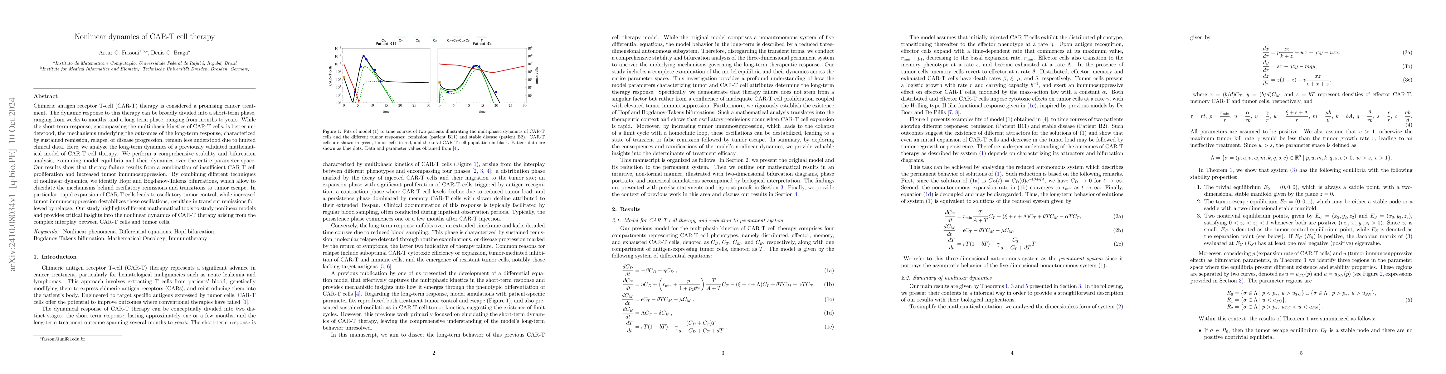 This research explores the long-term dynamics of CAR-T cell therapy using a mathematical model, revealing that therapy failure often results from insufficient CAR-T cell proliferation and increased tumor immunosuppression. The study employs nonlinear dynamics techniques to identify bifurcations, which explain oscillatory remissions and tumor escape mechanisms.