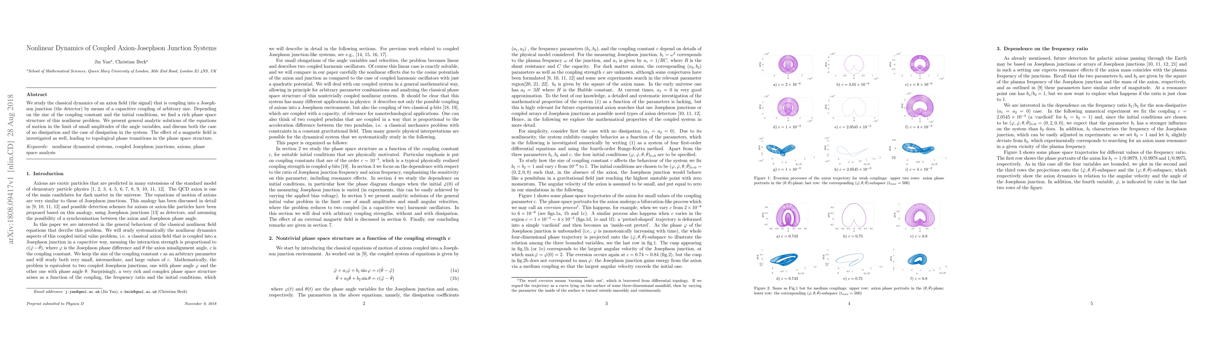 We study the classical dynamics of an axion field (the signal) that is coupling into a Josephson junction (the detector) by means of a capacitive coupling of arbitrary size. Depending on the size of the coupling constant and the initial conditions, we find a rich phase space structure of this nonlinear problem. We present general analytic solutions of the equations of motion in the limit of small amplitudes of the angle variables, and discuss both the case of no dissipation and the case of dissipation in the system. The effect of a magnetic field is investigated as well, leading to topological phase transitions in the phase space structure.