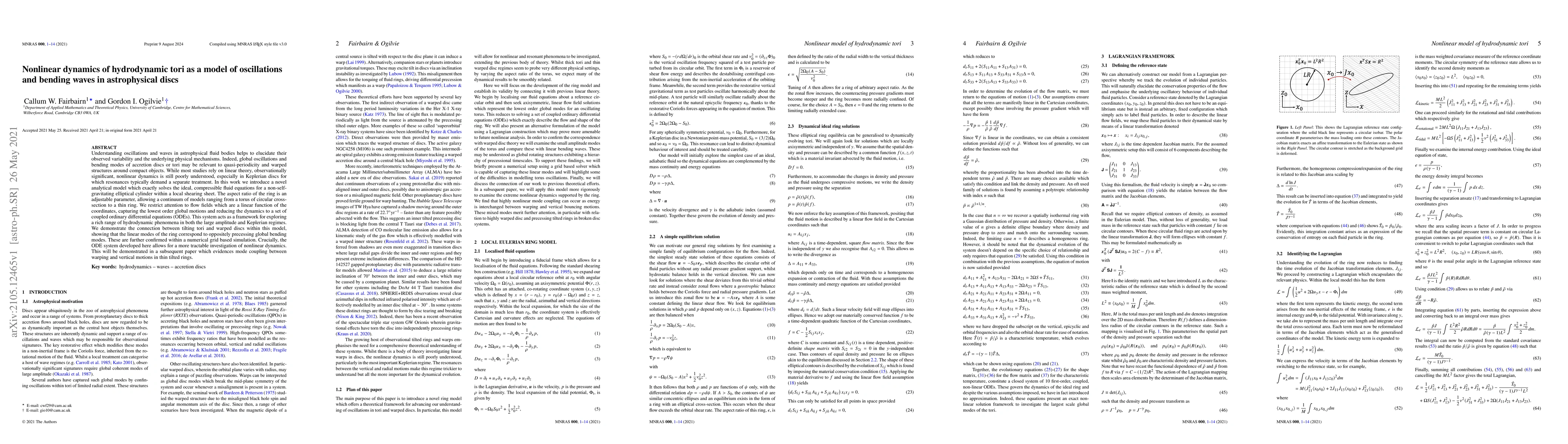 This paper introduces an analytical model to solve the ideal, compressible fluid dynamics of hydrodynamic tori, focusing on nonlinear oscillations and bending waves in astrophysical discs. The model captures global motions and reduces dynamics to coupled ODEs, providing insights into the connection between tilting tori and warped discs, and setting the stage for future studies on nonlinear dynamics and mode coupling.